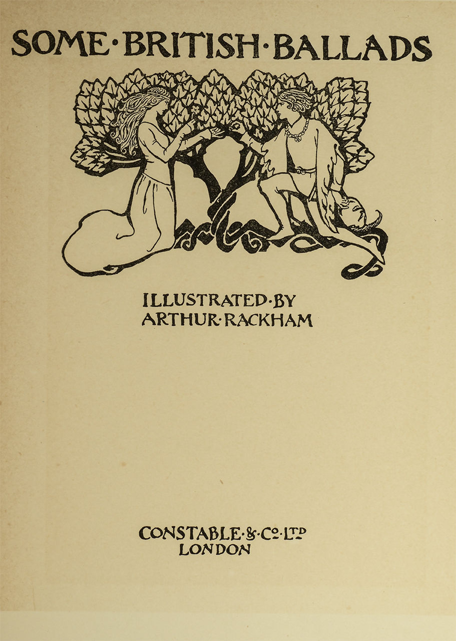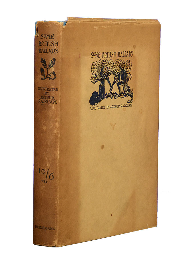 The delightful copy contains a collection of historic British poems, with sixteen charming medievalizing illustrations by Rackham. "Few of Mr Rackham's work have been more consistently impressed with charm and beauty than his illustrations in colour to Some British Ballads. In them he pictures a succession of fascinating heroines habited in quaint and picturesque costumes, amid surroundings which, though belonging to no definite place or period, are always appropriate and congruous. His heroes are hardly less charming than his heroines, and the scenes in which they are represented constitute a series of fascinating and delightful pictures ... one must feel grateful to Mr Rackham for giving us the prettiest picture book of the season" (The Connoisseur).