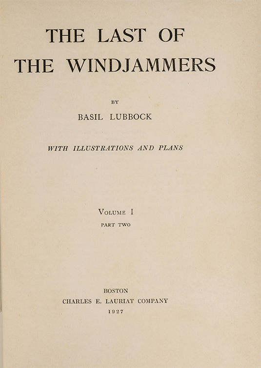 "Here is a real book of the sea, another welcome break in the hasty, monotonous, superficial collections that have made their appearance to exploit the thirst for genuine sea literature created mainly by the appearance of Mr. Lubbock's world- famous books on Clippers and Frigates, narratives that have stirred the emotions and thoughts of readers even far removed from actual seafaring. This book, which will be published in two volumes, will complete the series which commenced with the China Clippers and deals, in particular, with those ships and trades which were not included in the previous volumes. The book was planned to take in every Sailing Ship of any note from the year of the opening of the Suez Canal to the present day, but in practice vessels of a very much earlier date have often been included, especially when sketching the early history of shipping firms. Volume I. is divided into Three Parts. The first deals with the Life and Personnel in Sail, with a chapter on the History of Cape Horn. Part II. is devoted to the vessels in the big Sailing Ship Trades, such as the Jute Clippers and Grain Carriers. Part III. is devoted entirely to the Small Fry -- Swansea Copper-ore-men, Clipper Barques in the South and West African Trades, Intercolonial and South Sea Traders, Fruit Schooners and Fish Carriers. The illustrations and plans, which are very numerous, have been carefully selected and are intended to provide a pictorial record of the last seventy years of the now almost extinct Windjammer. Never before have so many particulars of voyages, incidents and names been included in one boon. It is a simple seamanlike narrative, told in Mr. Lubbock's inimitable style beloved by seafarers and relished by those who love the sea and its traditions. It is a book you will be really proud to possess -- and guard! "(Publisher's prospectus for volume 1).