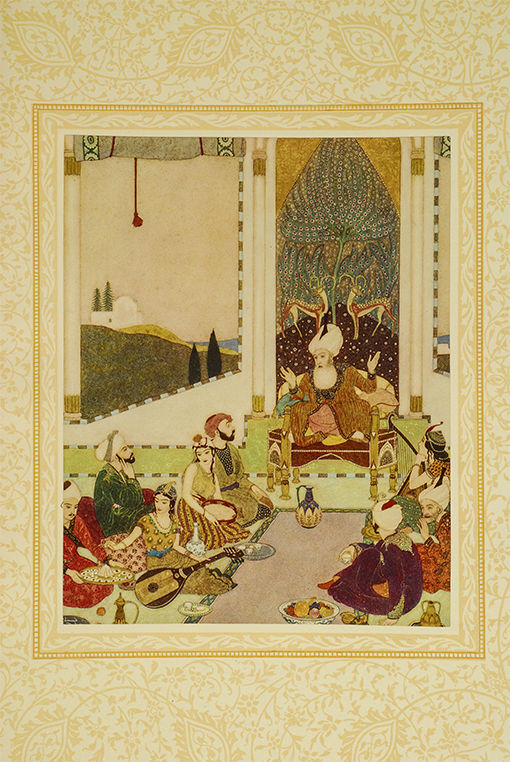 "In some of the pictures for this book Dulac continues with the style developed for Princess Badoura the year before. In others, he reduces the scale and adds a richness of detail to create an effect similar to that seen in Persian and Indian miniature art. The pictures are generally serious but Dulac's ever-present humor creeps in" (Hughey). "The fantasies which Scheherazade wove...need a jeweled commentator, and Dulac alone possesses the necessary gifts" (Birnbaum).