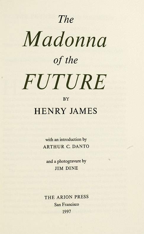 Originally appearing in The Atlantic Monthly in March 1873, James' The Madonna of the future was hailed as a masterpiece. The narrative of two gentlemen discussing art, life and deferred fame over cigars following a dinner has here been reimagined by photographer Jim Dine. Fine.