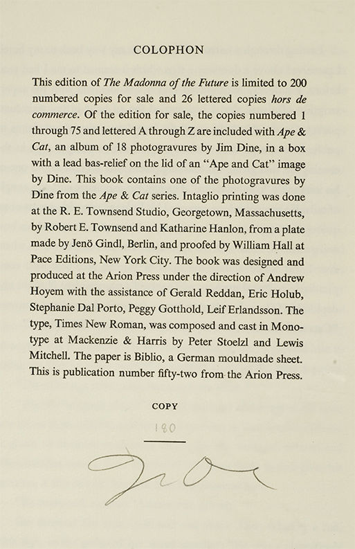San Francisco: Arion Press, 1997. First Thus. Fine. Publisher's cloth binding in Fine condition. Limited to 250 numbered copies, signed by Jim Dine, this being copy number 180. Quarto (12 1/4 x 8 3/4 in; 311 x 220 mm). Complete, including one photogravure by Jim Dine.