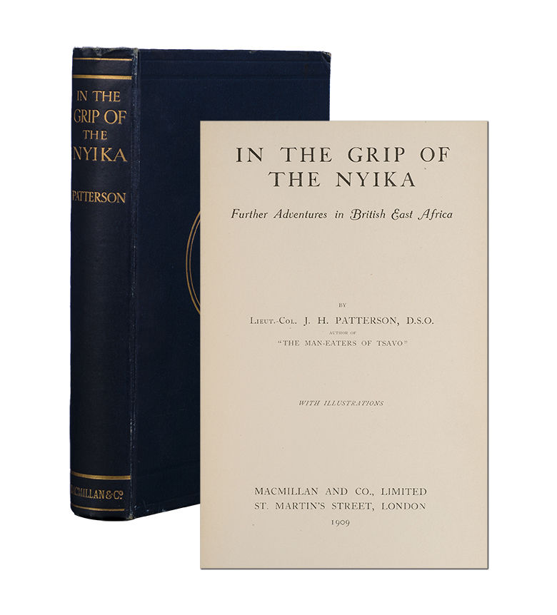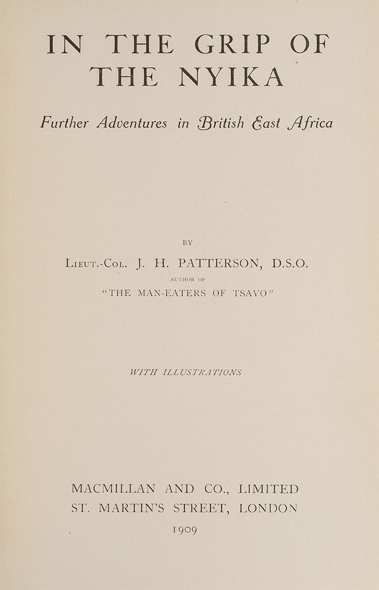 "In the following pages I have endeavoured to give a plain account of the trials and adventures which befell me on two recent expeditions through the nyika, or wilderness, in British East Africa. On the first trip there were three of us, and all returned safely to civilisation, although dangers were not wholly absent. On the second and longer expedition there were also three Europeans, but, alas! only two got back, the nyika having claimed the third; nor was the god of the wilds content with this sacrifice, for, in addition, he claimed several of my native followers. He laid his deadly grip on me as well, but I was wrested from him by the care and attention of my companion, to whose skilful nursing I feel I owe my life." Written by Lieutenant-Colonel John Henry Patterson, DSO (1867-1947), known as J. H. Patterson, a British soldier, hunter, author and Christian Zionist, best known for his book The Man-Eaters of Tsavo (1907), which details his experiences while building a railway bridge over the Tsavo river in Kenya in 1898-99. In the First World War, Patterson was the commander of the Jewish Legion.