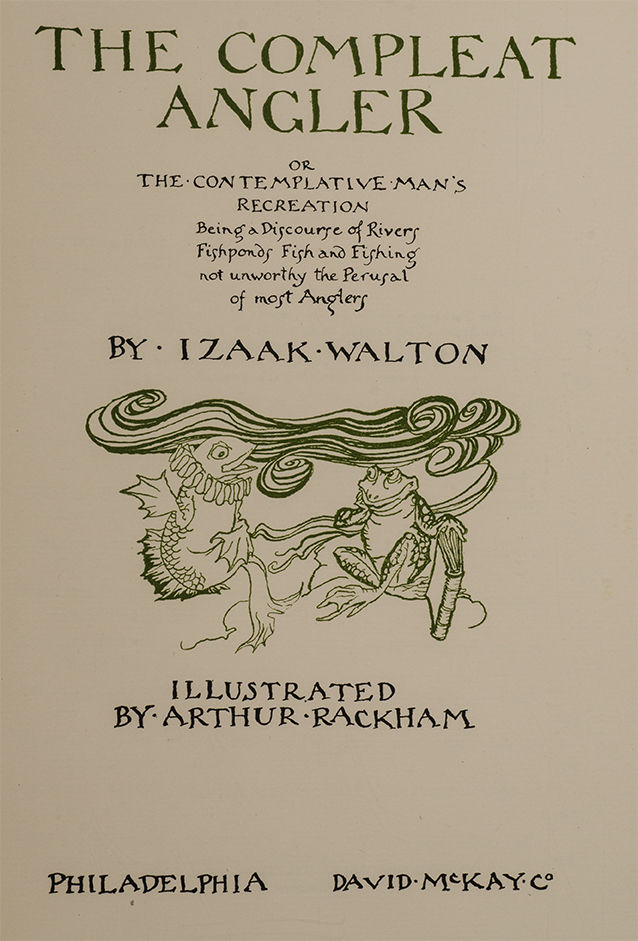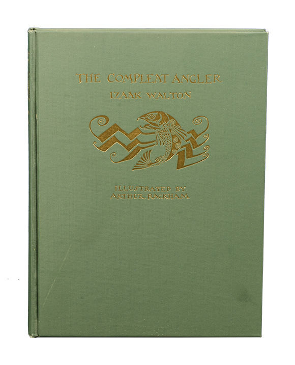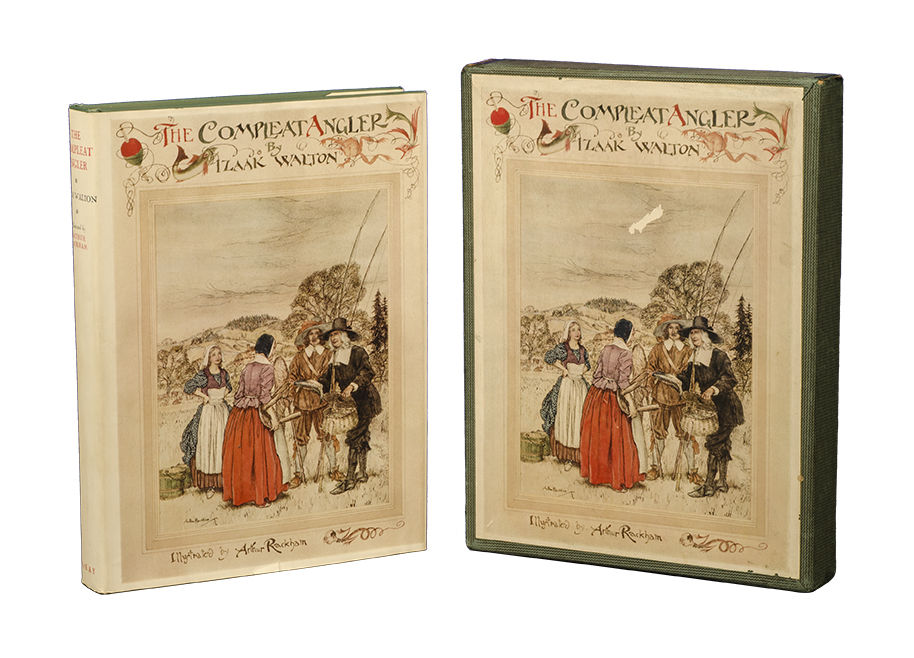 Philadelphia: David McKay Co, 1931. First American trade edition. Quarto (9 7/16 x 7 3/16 inches; 239 x 183 mm.). Collating 223, (1). Publishers dark blue ribbed cloth over boards, front cover and spine decoratively stamped in gilt. Pictorial endpapers, top edge gilt. Twelve color plates, including frontispiece, with captioned tissue guards. Twenty-five black and white illustrations. Title printed in green and black. A very Fine copy with the original color pictorial dust jacket with a 'titled' version of the color plate "Marry, God requite you, sir, and we'll eat it cheerfully" (facing p. 82) on the front panel. Original blue cardboard box with the same color illustration as on the dust jacket pasted on the top panel and a white label "The Compleat Angler / Izaak Walton / Illustrated by Arthur Rackham" on the lower edge. Two corners of box lid neatly repaired.