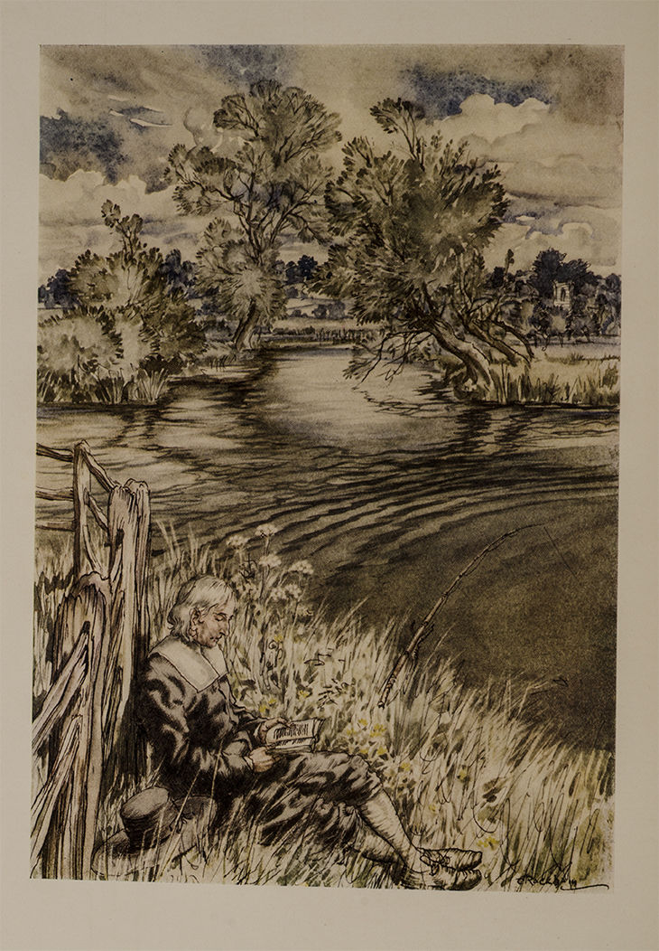 Izaak Walton's The Compleate Angeler (1653) is perhaps the quintessential pastoral work on fishing: Structured as a dialogue between a fisherman, huntsman, and fowler, the book is a celebration of the natural world and the thrills of fishing as a pastime. Here the text is visualized with Arthur Rackham's unparalleled illustrations, making it a delight for fishing enthusiasts and collectors alike. Despite Rackham’s illness and personal struggles during the project, it was seen as an opportunity to revitalize his career. "No fewer than six plates have landscape backgrounds, plates which should remind us of Rackham's very serious reputation as a landscape painter, with a fine vision of natural forms" (Gettings).