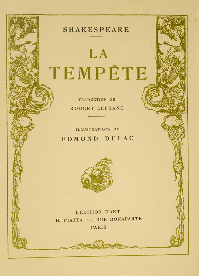 Paris: L'Édition D'Art H. Piazza, 1912. First edition in French. First edition in French under this title, a translation of Shakespeare's play. Publisher's original wrappers with sea nymph vignette, in original glassine dust jacket. Aside from a few small nicks to the glassine jacket, this is a Near Fine copy. Quarto (11 7/8 x 9 1/4 in; 303 x 236 mm). 108, [2] pp with decorative wave borders. Forty mounted color plates with line borders, and captioned tissue guards. Title-page with Dulac-designed borders and galleon vignette. Five section headpieces, tailpieces, including one tailpiece of an owl at end of Act Five not found in earlier French or English editions.