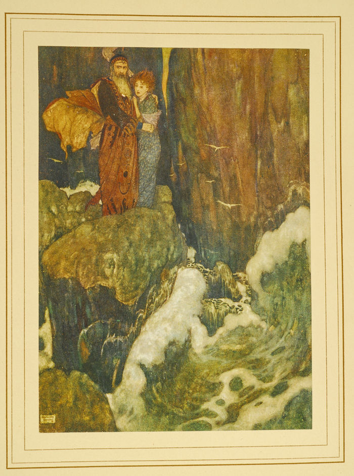 The companion volume to Dulac's L'Ile Enchanteé. Conte d'Apres Shakespeare (1908), the latter a prose adaptation of Shakespeare's The Tempest, the volume under notice a strict French translation of that play. "The Tempest was Dulac's second major gift book work...[He] can be considered a perfect illustrator for Shakespeare because of his tendency to always mix in with serious pictures some humorous ones, just as Shakespeare inserted scenes of comic relief between his serious ones. Also, like Shakespeare, who is sometimes believed to have been a sailor because of his knowledge of seagoing lore, Dulac shows sensitivity to the nuances of the sea with his beautiful greens and blues and patterns of surf and rock" (Hughey).