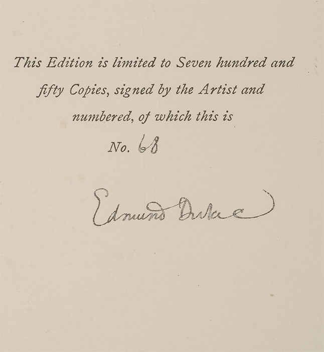 London: Hodder and Stoughton, 1909. First Thus. Limited to 750 copies, numbered and signed by the artist (this copy being 68). Large quarto (12 5/16 x 9 7/8 inches; 313 x 250 mm.). [124] pages (including inserted title). Original vellum over boards pictorially stamped and lettered in gilt on front cover and spine. Later silk ties. Top edge gilt, others uncut. Tan end-papers stamped in light olive green with a repeated peacock feather design. Ink name on front paste-down. Twenty color plates mounted on buff vellum-like paper with gilt over tan decorative borders. With descriptive tissue guards. Text printed on rectos only within a brown decorative border. Minimal discoloration to vellum, front board very slightly bowed, otherwise a Near Fine copy.