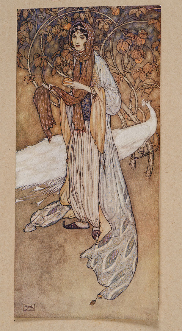 "The Arabian Nights illustrations caught the attention of all the contemporary reviewers. The October Bookman published Dulac's portrait with the prophetic caption: 'those fifty colour illustrations for The Arabian Nights will soon be the talk of the literary and artistic community'...Recognition also came from Black & White magazine...'A new illustrator has arisen, and of the strength and originality of his work there can be no two opinions'...The London Times followed... : 'Mr. Dulac's distinction is that he is as good on the poetical side as on the grotesque...he has a truly exquisite sense of colour, and of noble design...'" (Hughey).