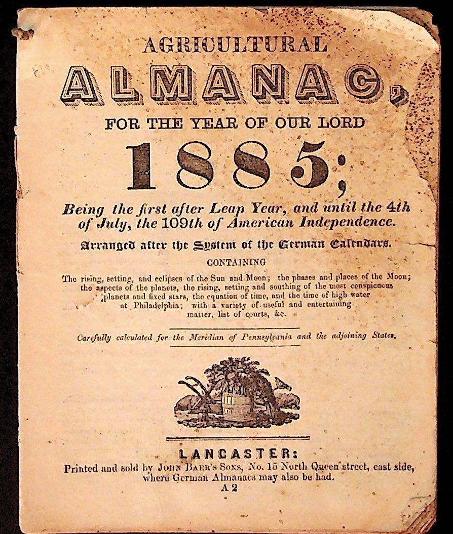 Lancaster: John Baer's Sons, 1885. Paperback. Very Good. Paperback. Includes information on cycles of the sun, moon, and planets along with water tables in Philadelphia, and a variety of useful and entertaining matter, etc. Lacks front and rear covers. Very good in off-white paper wrappers with black title to front wrapper. Creasing to corners with a few closed tears and chips to edges of wrappers. Soiling / spotting to edges and margins of most pages with some text affected. String to top corner for hanging. About 30 pages. Almanacs ALM072720.