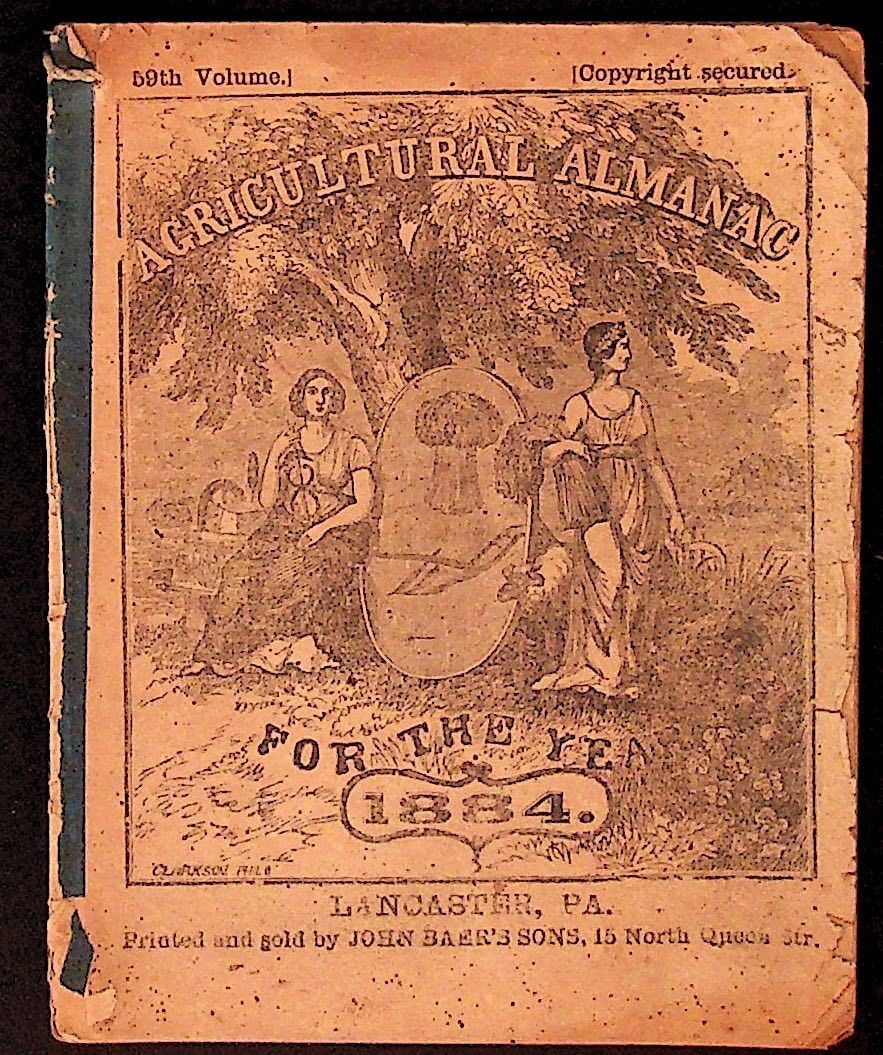 Lancaster: John Baer's Sons, 1884. Paperback. Very Good. Paperback. Includes information on cycles of the sun, moon, and planets along with water tables in Philadelphia, and a variety of useful and entertaining matter, etc. Very good in off-white paper wrappers with black title and illustration to front wrapper. Spine has been reinforced / repaired with paper. Creasing to some corners with a few closed tears / chipping to edges of some pages and wrappers. Minor soiling / spotting throughout. Browning. String to top corner for hanging. About 32 pages. Almanacs ALM072720.