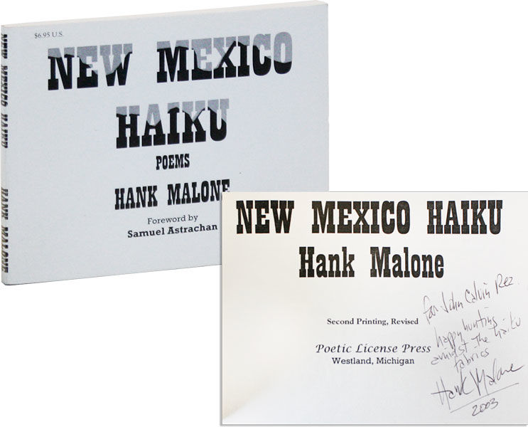 Westland, MI: Poetic License Press, 1998. Near Fine. Westland, MI: Poetic License Press, [1998]. Second Printing, Revised. Oblong 16mo; publisher's glossy white card wrappers; vii,[1],100pp. Glue residue from previously removed sticker on rear wrapper, else Near Fine. Inscribed and signed to the late Minnesota poet John Rezmerski on title page: "happy hunting amidst the haiku fabrics / Hank Malone / 2003.