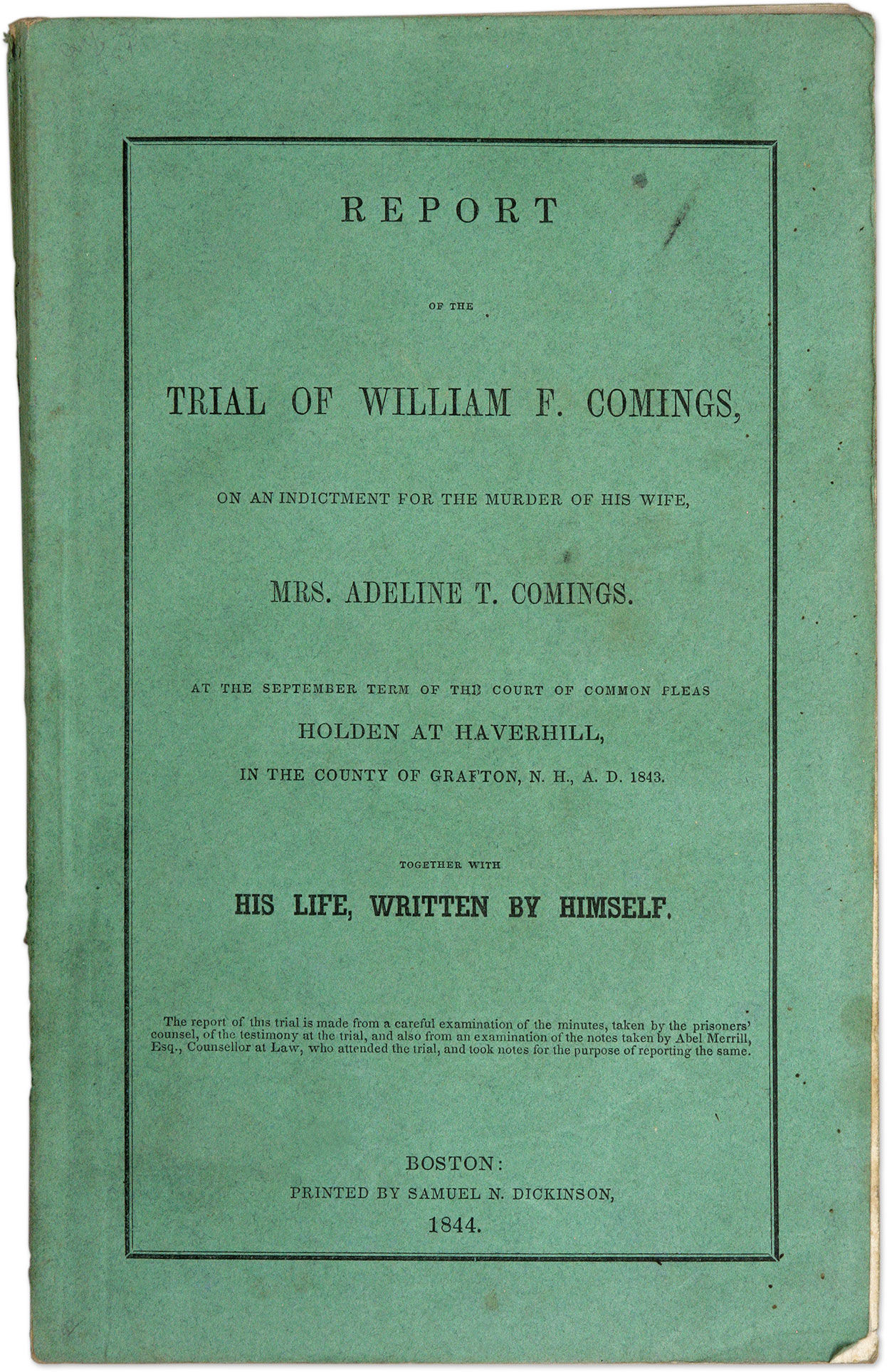 1844. Boston: Samuel N. Dickinson, 1844.. Boston: Samuel N. Dickinson, 1844. He Tried to Make the Murder of His Wife Seem Like a Suicide: McDade 208 [Trial]. Comings, William F. [d. 1844], Defendant. Report of the Trial of William F. Comings: On an Indictment for the Murder of His Wife, Mrs. Adeline T. Comings. At the September Term of the Court of Common Pleas Holden at Haverhill, In the County of Grafton, N.H., A.D. 1843. Together with His Life, Written by Himself. Boston: Printed by Samuel N. Dickinson, 1844. 158 pp. Octavo (9" x 5-1/2"; 23 x 14 cm). Stab-stitched pamphlet in printed wrappers. Light soiling and a few minor marks to wrappers, light wear to spine ends and corners, rear joint and adjacent signature just starting to detach at foot, some loss to foot of fore-edge of rear half of text block with no loss to text. Light toning to text, somewhat heavier in places, occasional light foxing. $750. * Only edition. "He was convicted of strangling his wife at Bath, N.H., with a handkerchief, and suspending her from a bedpost to make it appear to be suicide" (McDade). OCLC locates 5 copies in law libraries (Library of Congress, New York University, Social Law Library, University of Missouri, Yale). McDade, The Annals of Murder 208.