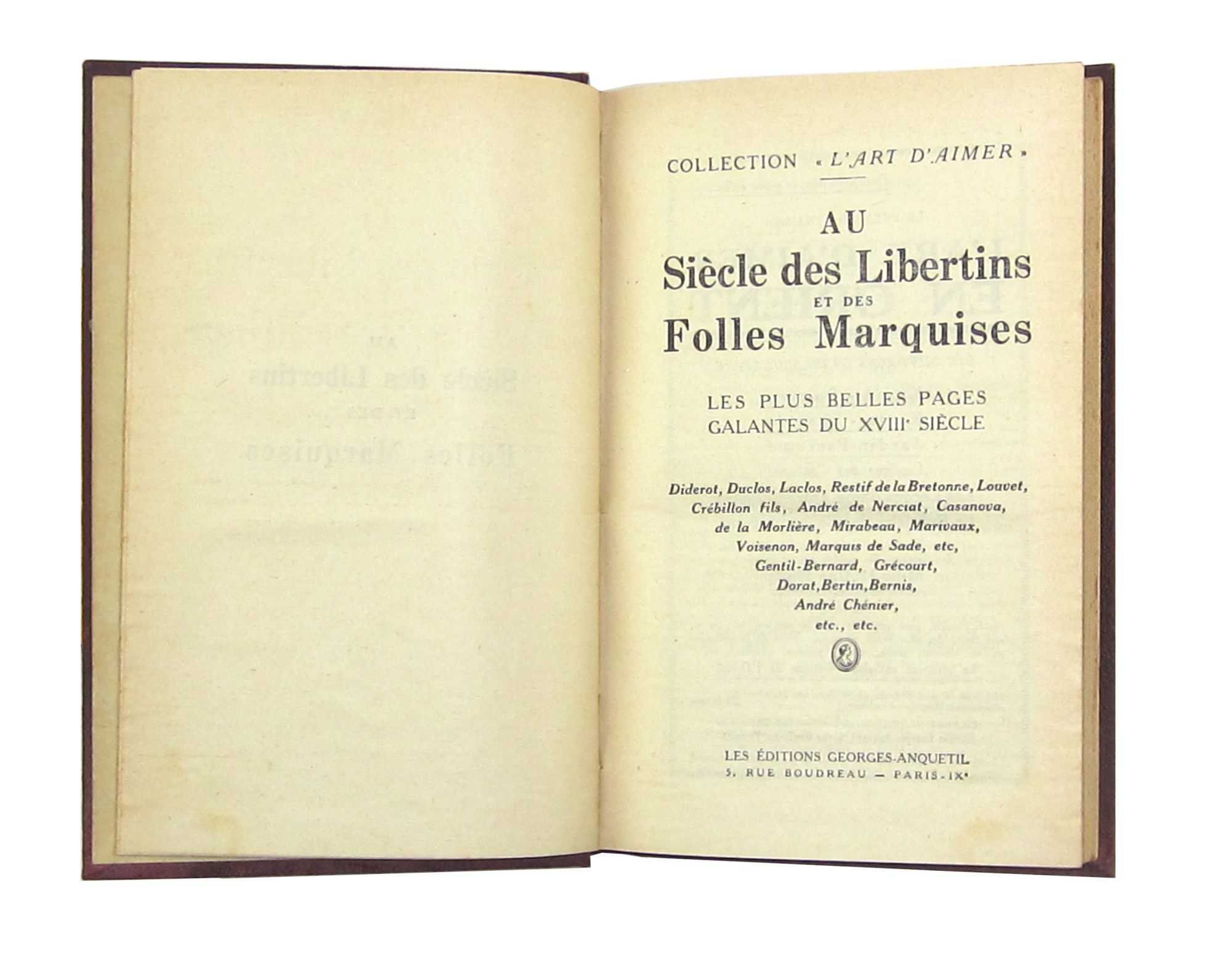 Bottom margins of both covers discolored from exposure to damp, text block uniformly toned, else Good to Very Good overall. Anthology of 18th-century French erotic and romantic literature. Authors include Diderot, Laclos, Casanova, Molière, the Marquis de Sade, and many others.