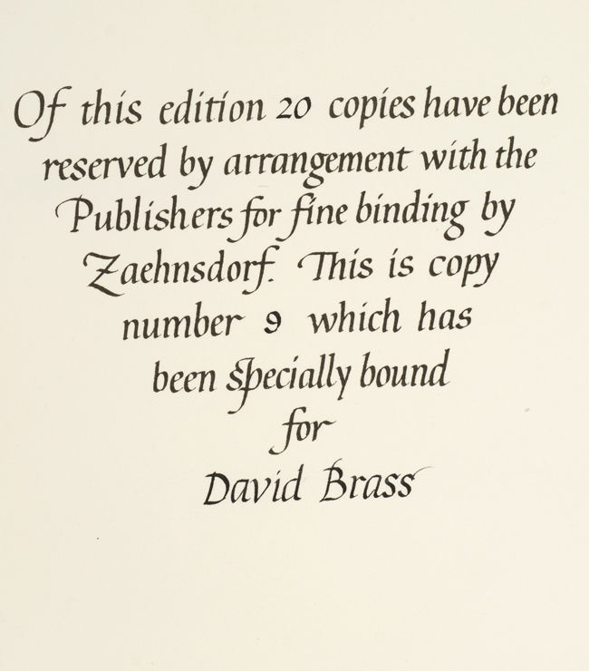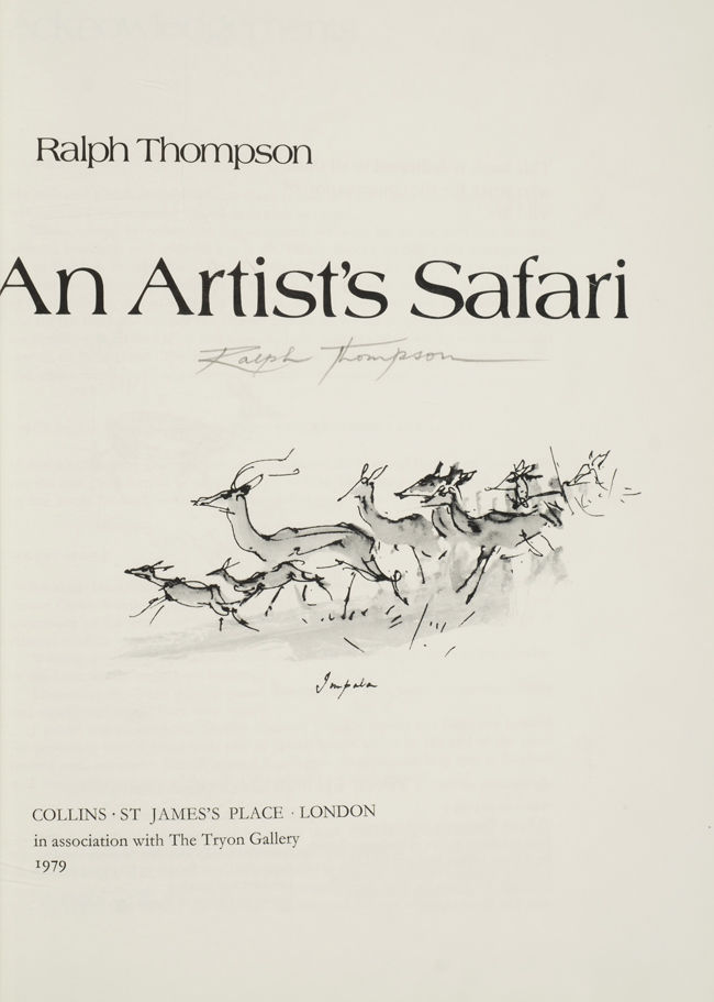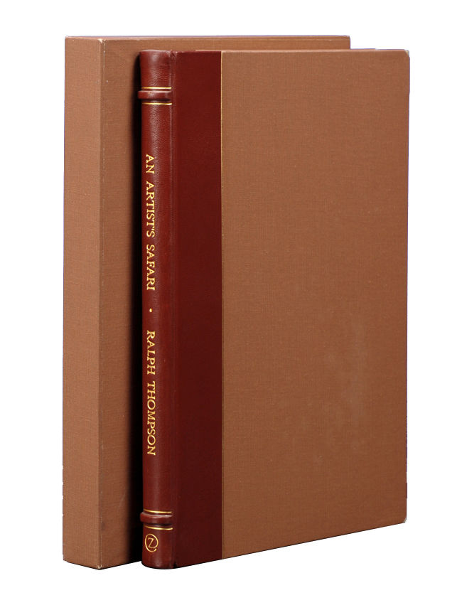 “Of this edition 20 copies have been reserved by arrangement with the Publishers for fine binding by Zaehnsdorf. This is copy number 9 which has been specially bound for David Brass” (calligraphed on an inserted limitation leaf at front). “This book was first published in 1970. I was fortunate to make this safari in East Africa before the Federation broke up and the different countries went their separate ways. It is, of course, still possible to see the parks mentioned in the book. This new edition is published in a format which, it is hoped, will be much more convenient to handle. It should therefore be easier to examine the pen drawings, and it is these which I regard as the kernel of the book. Although some of the colour plates are now shown as single-page ‘details’ only, it is to be hoped that this more manageable format will make the new Artist’s Safari a welcome successor to the first edition” (verso of half-title).