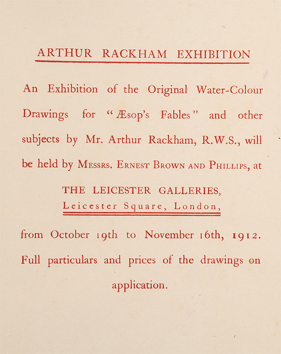 London: William Heinemann, 1912. First trade edition. Small square octavo (8 x 5 7/8 inches; 202 x 149 mm.). Collating xxix, [1, blank], 223, [1]. Complete with the original color pictorial dust jacket, the front panel with a reproduction of the color plate facing p. 84 "The Blackamoor", the spine correctly priced "6/= net" and advertising the 1912 Heinemann publication "The Four Gardens on the back". Dust jacket chipped at lower left of front panel, small chip on lower right corner, and small chip at top of spine, but with no loss of lettering. One small 'tape' stain at top of jacket spine. An excellent example of this original pictorial dust jacket. Publisher's green cloth, front cover and spine pictorially decorated and lettered in gilt, lower cover with publisher's blind stamp, pictorial end-papers printed in green, top edge stained green. Very slight browning on pictorial front end-paper from loosely inserted Leicester Galleries leaflet. Thirteen color plates, including frontispiece, with captioned tissue guards, fifty-three black and white drawings of which nineteen are full page. A Fine and bright copy.