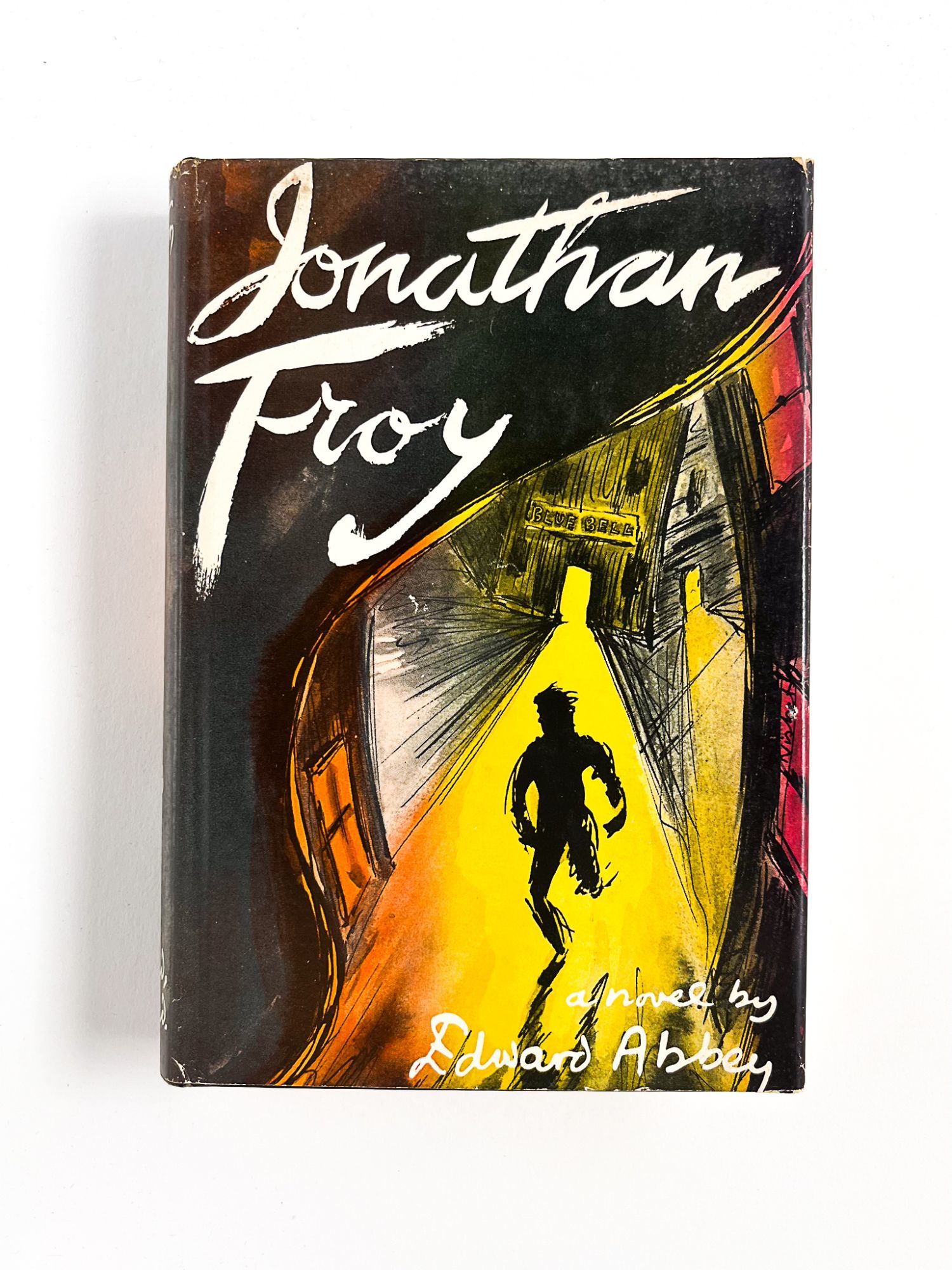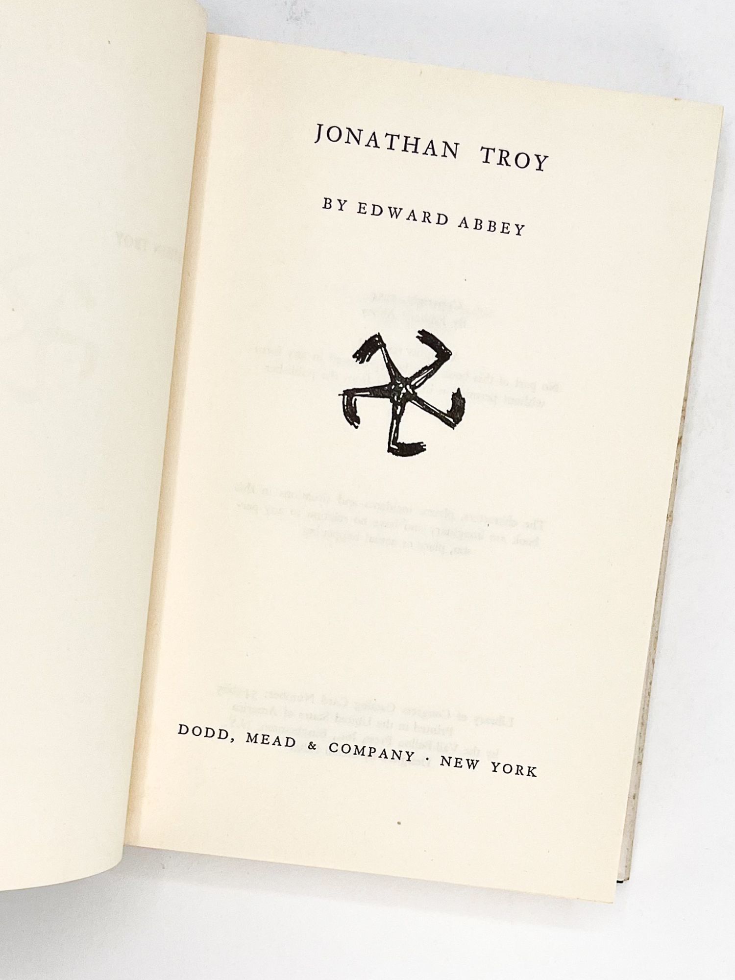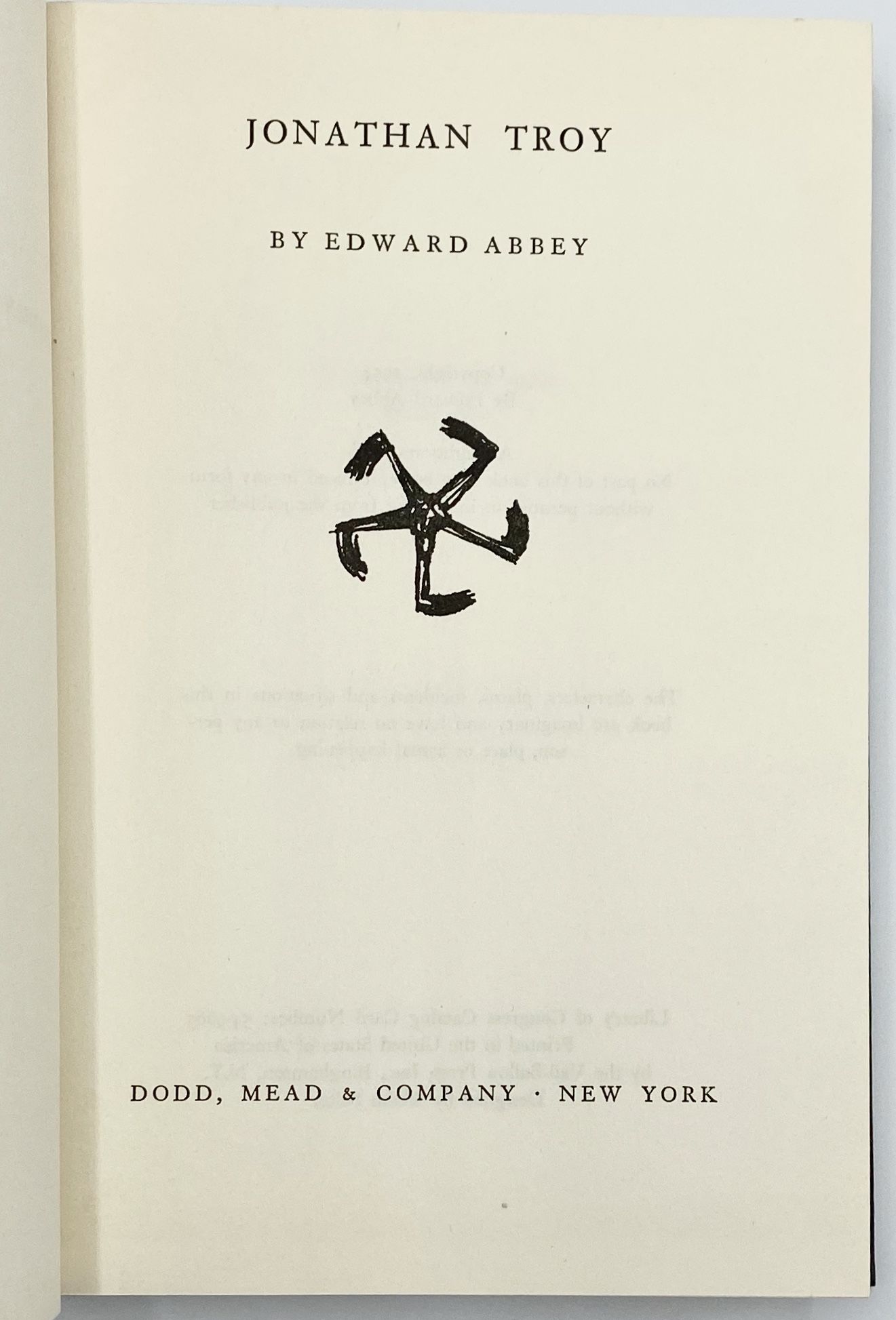 New York: Dodd, Mead & Company, 1954. First edition. Near fine in near fine jacket.. First printing – and only edition – of Abbey's first book, talked about but rarely seen by Abbey aficionados. Abbey's biography James A. Cahalan describes how embarrassed the author would become about his first novel: "Abbey remained so unhappy with his first novel that he always refused to have it reprinted [...] and left instructions that it not be reprinted after his death. As a result, JONATHAN TROY became a very expensive collector's item." Nevertheless, he concludes: "Abbey was too hard on himself; this novel is certainly flawed, yet interesting." A truly lovely copy of a scarce book. 8'' x 5''. Original black glazed paper boards, yellow-lettered spine. In original unclipped ($3.50) color pictorial dust jacket designed by Stefan Salter. [8], 374 pages. Faint offsetting to endpapers. Jacket lightly rubbed at spine head, with foxing to top edge.