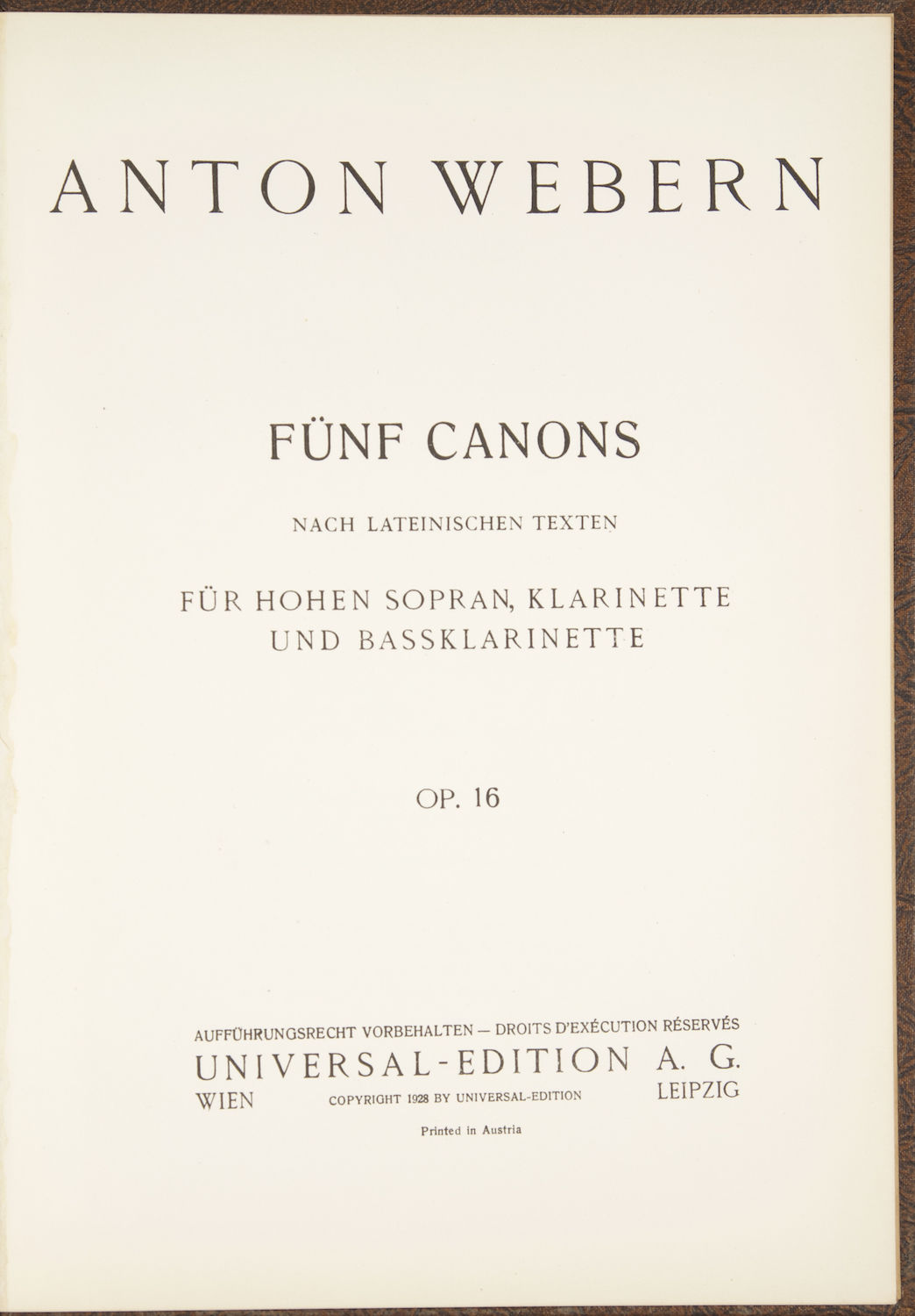 Wien: Universal-Edition [PN U.E. 9522], 1928. Large octavo. Full dark brown cloth; titling gilt to spine. 1f. (title), [1] (sung texts), 4-13, [1] (blank) pp.