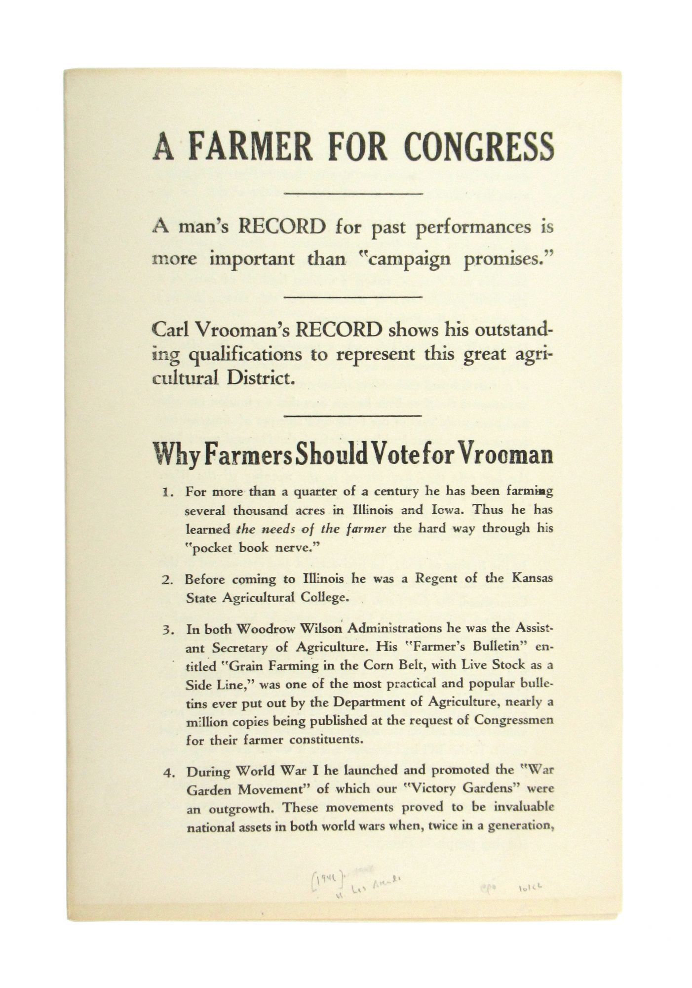 Campaign flyer supporting the (failed) congressional bid of Carl Vrooman, former Assistant Secretary of Agriculture under President Woodrow Wilson. The text is comprised of fifteen bullet points regarding Vrooman's "outstanding qualifications, though as one constituent pointed out in an anonymous editorial, Vrooman was never in fact a farmer (see "The Pantagraph," November 2, 1946, p. 7). Not separately catalogued in OCLC as of February, 2025.