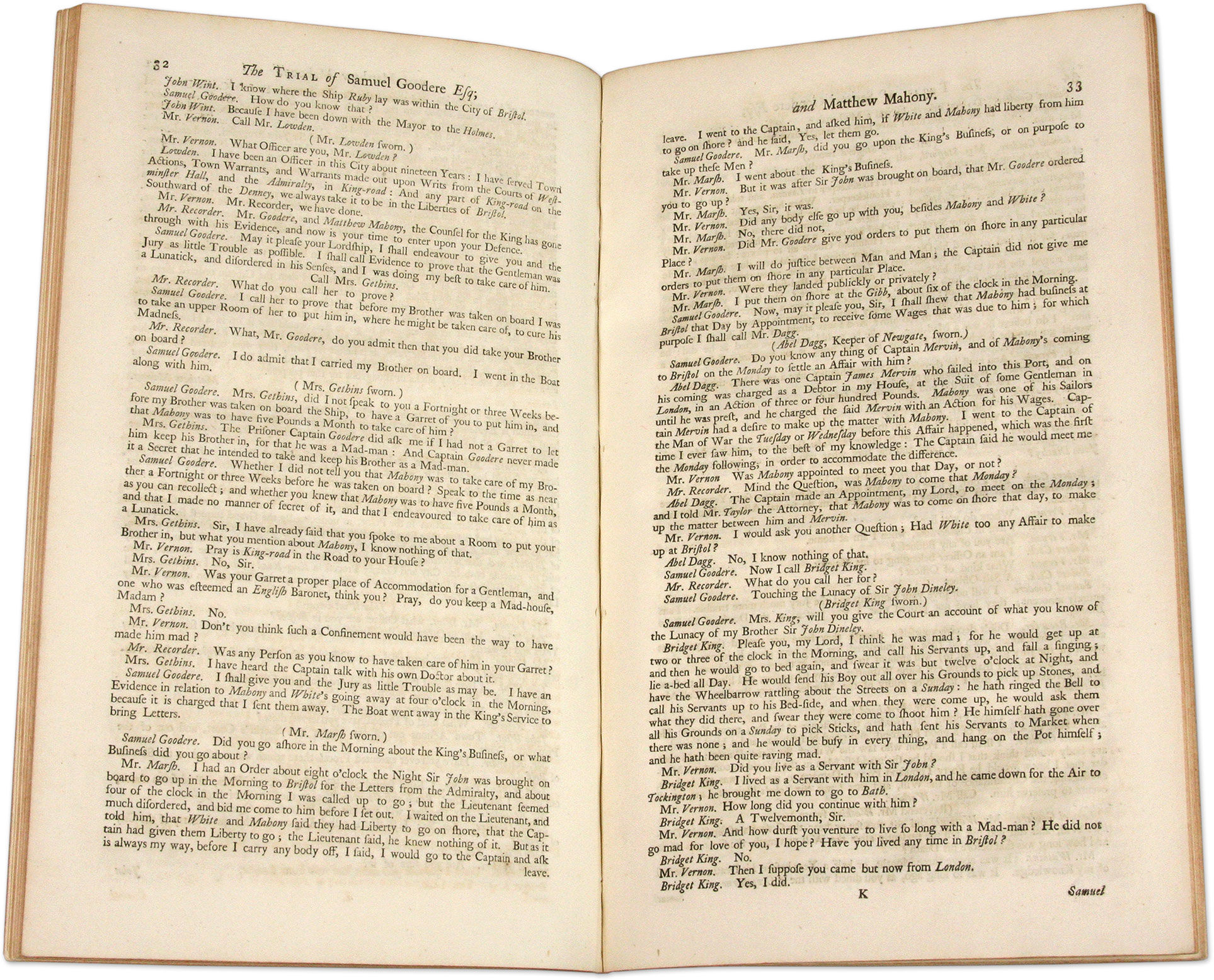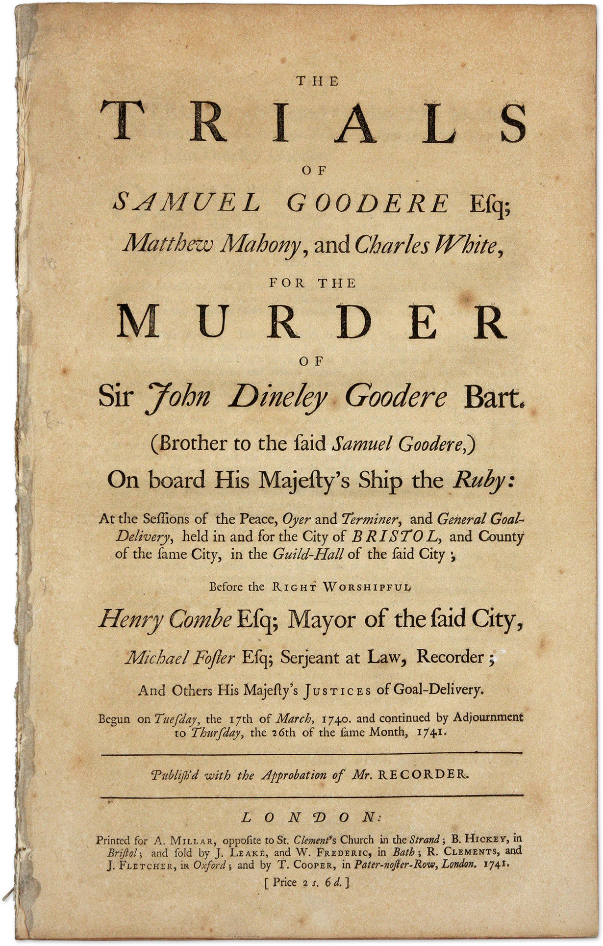 1741. Fratricide on the HMS Ruby [Trial]. Goodere, Sir Samuel [1687-1741], Principal Defendant. The Trials of Samuel Goodere Esq; Matthew Mahony, And Charles White, For the Murder of Sir John Dineley Goodere Bart. (Brother to the Said Samuel Goodere,) On Board His Majesty's Ship the Ruby: At the Sessions of the Peace, Oyer and Terminer, And General Goal-Delivery, Held in and for the City of Bristol, And County of the Same City, In the Guild-Hall of the Said City; Before the Right Worshipful Henry Combe Esq; Mayor of the Said City, Michael Foster Esq; Serjeant at Law, Recorder; And Others His Majesty's Justices of Goal-Delivery. Begun on Tuesday, the 17th of March, 1740. And Continued by Adjournment to Thursday, The 26th of the Same Month, 1741. Publish'd with the Approbation of Mr. Recorder. London: Printed by A. Millar, Opposite to St. Clement's Church in the Strand [et al.], 1741. [i], 53, [1] pp. Lacking initial advertisement leaf. Bookseller catalogue to verso of final leaf. Folio (12-1/2" x 8"). Disbound stab-stitched pamphlet. Light soiling to exterior, a bit of glue residue along spine, light toning to interior, light foxing to title page, light foxing and a minor smudges to a few other leaves. $750. * Only edition. The most complete account of this trial. Goodere was the captain of the HMS Ruby, which was moored near Bristol, England. Learning his brother, Sir John Goodere, was in that town, Captain Goodere sent crew members to abduct him and bring him on board. Goodere confined him in a cabin and oversaw his murder, which he claimed was a suicide. Shortly afterwards, one of Sir John's friends in Bristol noticed that he had disappeared and asked the town's mayor to investigate the matter. This investigation resulted in the arrest, trial and execution of Captain Goodere and his accomplices. OCLC locates 6 copies in North American law libraries (Harvard, Library of Congress, Northwestern, Social Law, University of Memphis, Yale). English Short-Title Catalogue T51718.