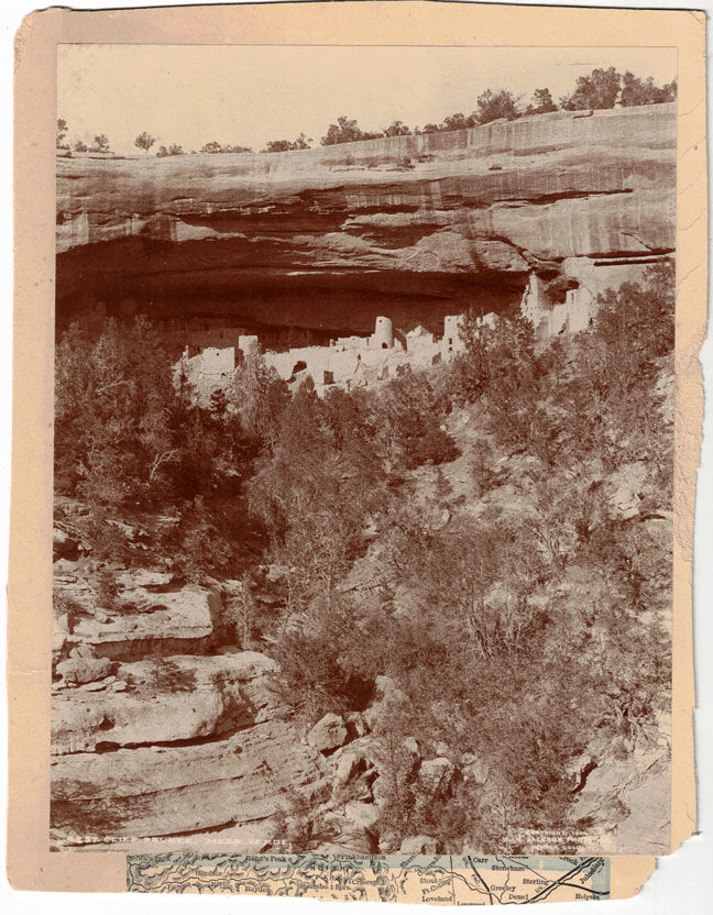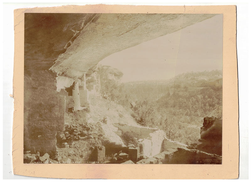 Two large format W. H. Jackson albumen photographs [7" x 9"] on mounts [8" x 10 1/2"]. Circa 1899. 4255. Cliff House. Looking Out; 4257. Cliff Palace. The mounts are a bit worn at the edges. Number 4255 has a 6" crease, and 4257 has a map strip of Colorado adhered along the bottom edge.