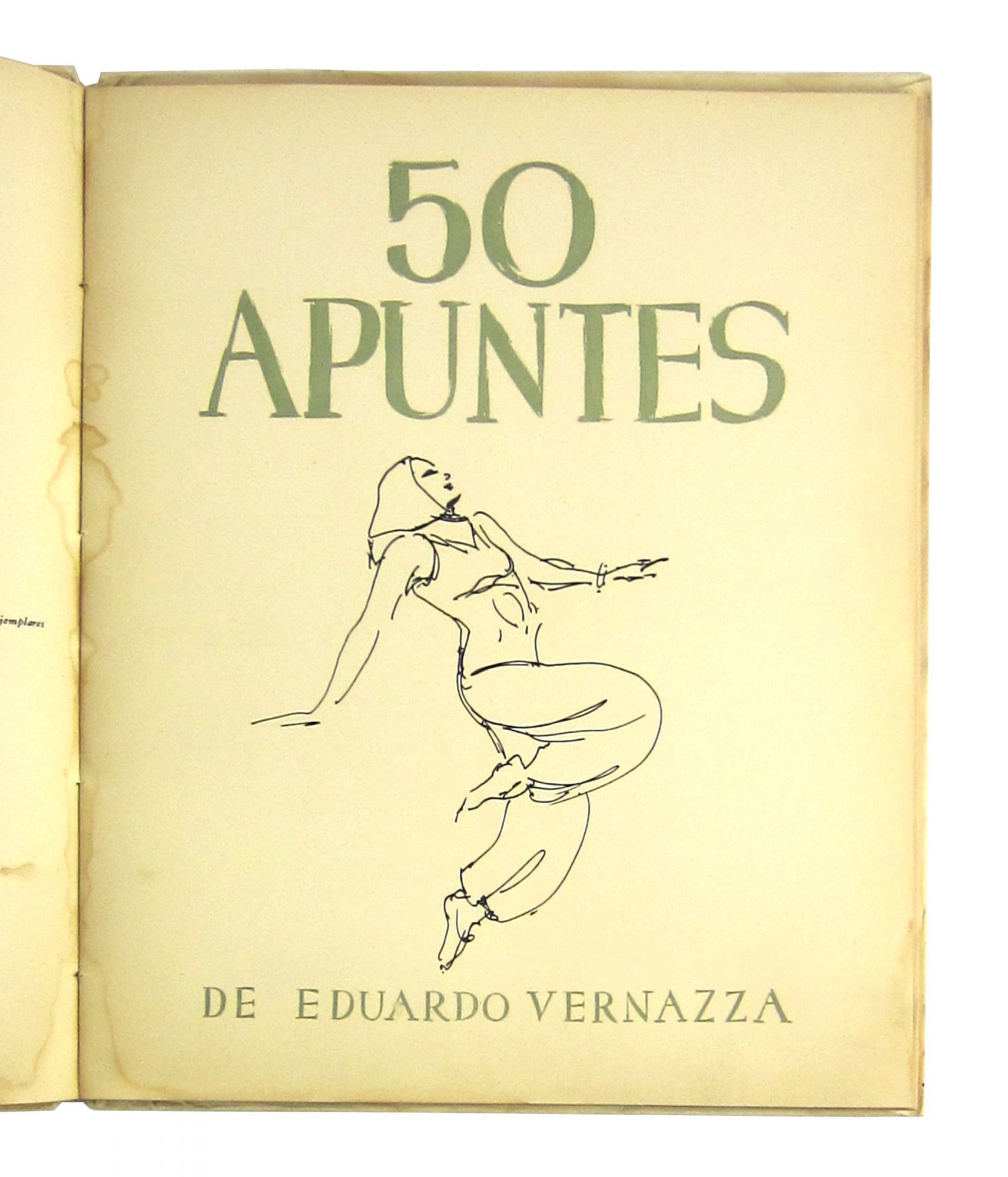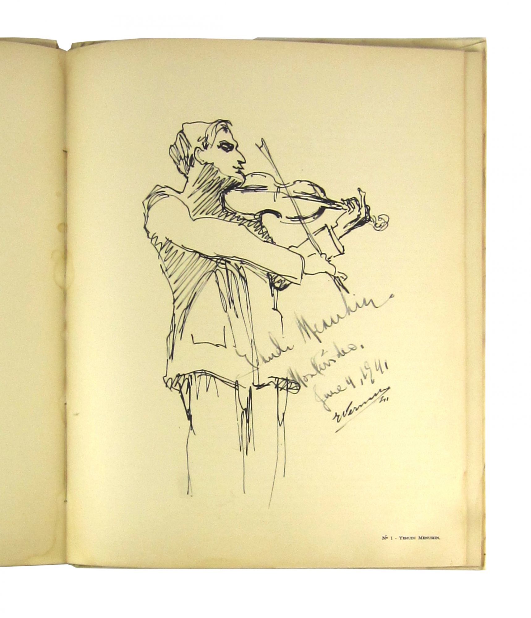 Eduardo Vernazza, a Uruguayan painter and art journalist, made "live" drawings-à la courtroom sketch-of the world's most celebrated performing artists in action. Subjects include Marian Anderson, Arturo Toscanini, Arthur Rubinstein, Igor Stravinsky, Louis Jouvet, Pablo Casals, Yehudi Menuhin, and many South American stars. Despite the unfortunate liquid stains, the album provides a remarkable record of stances, costumes, and characterizations from the mid 20th century for its most renowned actors and musicians.