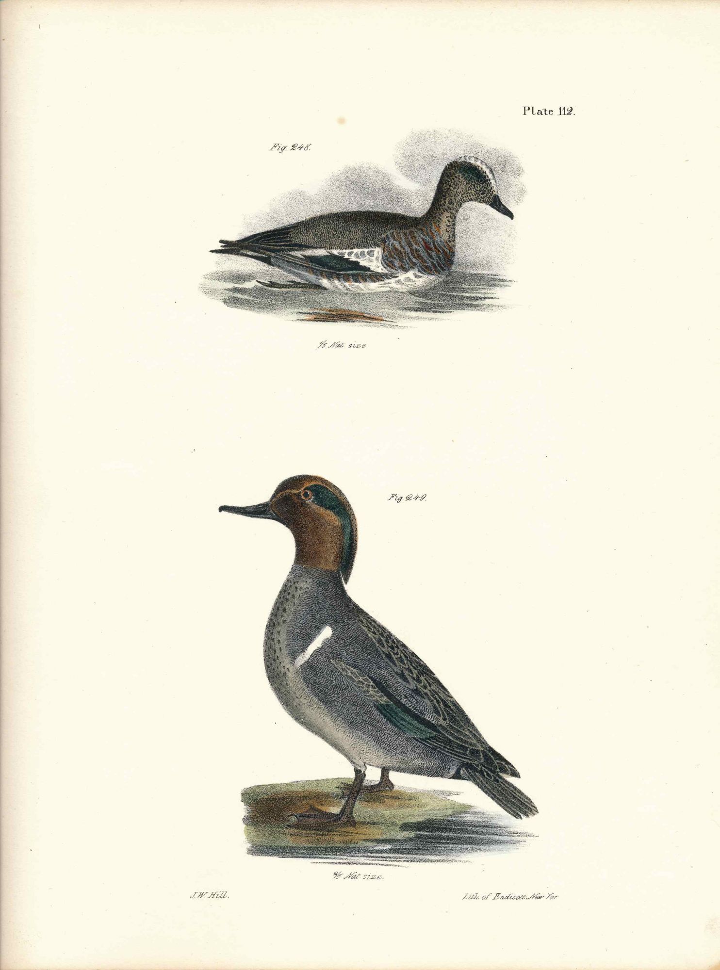 Albany: Carroll and Cook, 1844. Very Good. Hand colored lithograph of two birds, both ducks. Minor browning to edges. Light foxing. Size: 11 x 8.5 inches. Print/081220.