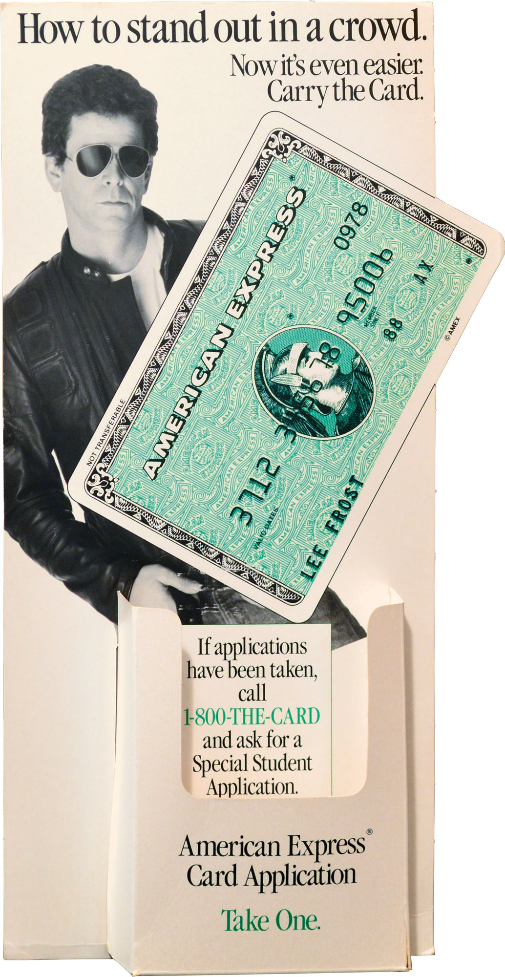 N.p.: N.p., 1988. Vintage 1988 cardboard display stand featuring Lou Reed, with a pocket for holding American Express application forms, expressly targeting college students. An artifact from Reed's brief phase as a corporate pitchman, which also saw him shilling for Honda scooters in an advertisement that repurposed "Walk on the Wild Side."