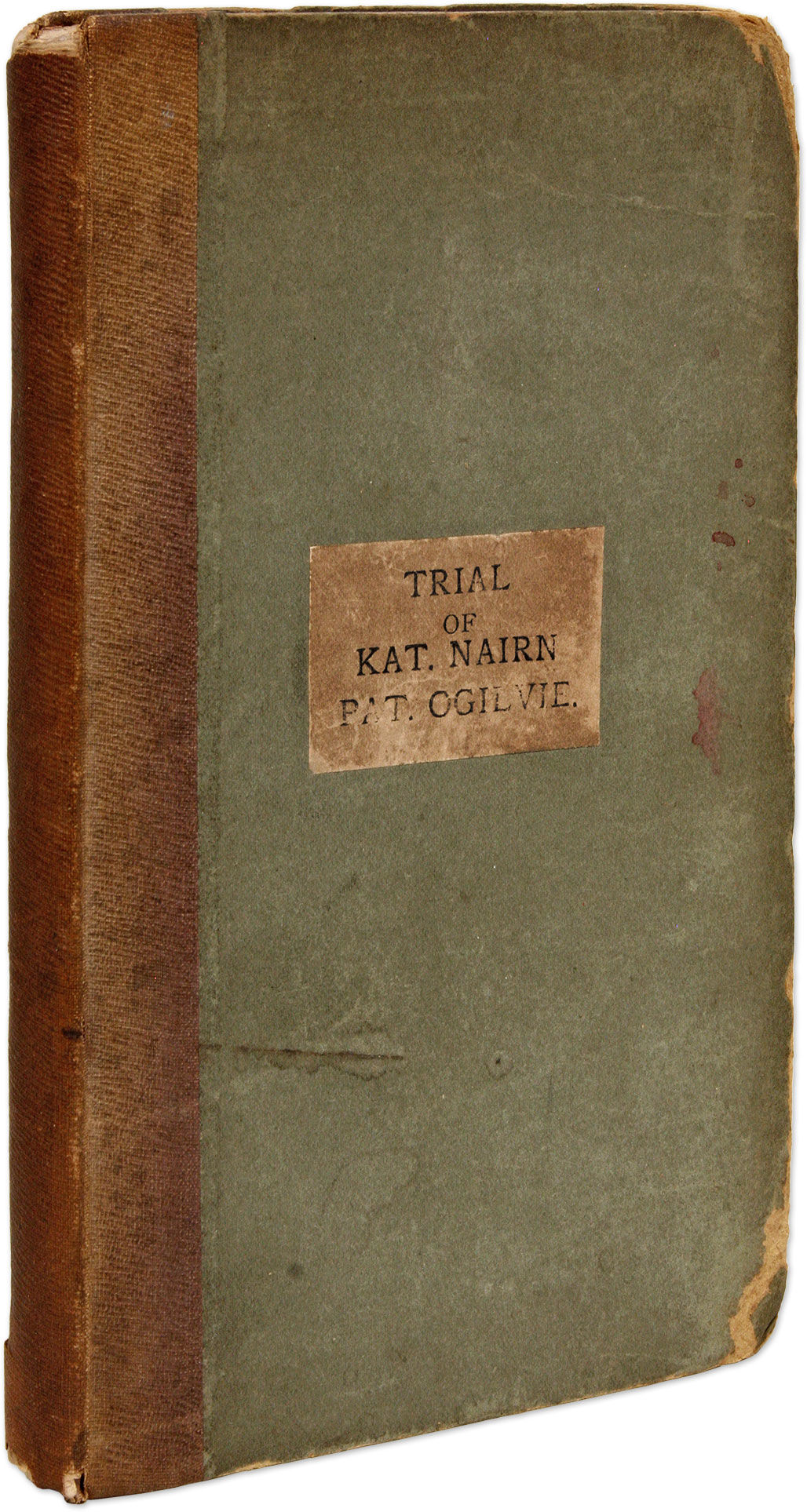 1765. London: T. Becket and P.A. de Hondt, 1765.. London: T. Becket and P.A. de Hondt, 1765. Incest and Murder in Edinburgh [Trial]. Nairn, Katharine, Defendant. Ogilvie, Patrick [d.1765], Defendant. The Trial of Katharine Nairn and Patrick Ogilvie, For the Crimes of Incest and Murder. Containing the Whole Procedure of the High Court of Judiciary, Upon the 5th, 12th, 13th, 14th, 15th, And 16th Days of August 1765. Edinburgh Printed: London: Reprinted, For T. Becket and P.A. de Hondt, 1765. [vi], 134 pp. Lacking half-title. Octavo (8-1/2" x 5"). Stab-stitched pamphlet with untrimmed edges bound into nineteenth-century cloth-backed boards, printed paper title panel to front board. Light soiling and a few minor stains, moderate rubbing to extremities, some wear to spine ends, corners bumped and somewhat worn, crack in text block between front free endpaper and title page. Moderate toning to text, light foxing to a few leaves, light staining to final few leaves of text, light soiling to title page and (blank) verso of final leaf. $650. * Only London edition, published the same year of the only Edinburgh edition. In January 1765, 19-year-old Katharine Nairn married 40 year-old Thomas Ogilvie. She soon fell in love with his younger brother, Patrick. In June the same year, Thomas Ogilvie died after a sudden illness. Katharine and Patrick were arrested and convicted of murder by poisoning. Patrick Ogilvie was hanged, but Katharine's execution was delayed when she was found to be pregnant. Placed in a lower-security section of the prison, she took an opportunity to escape and fled to France. She was never apprehended. This trial was the subject of a volume in the Notable British Trials series edited by William Roughead. English Short-Title Catalogue T51693.
