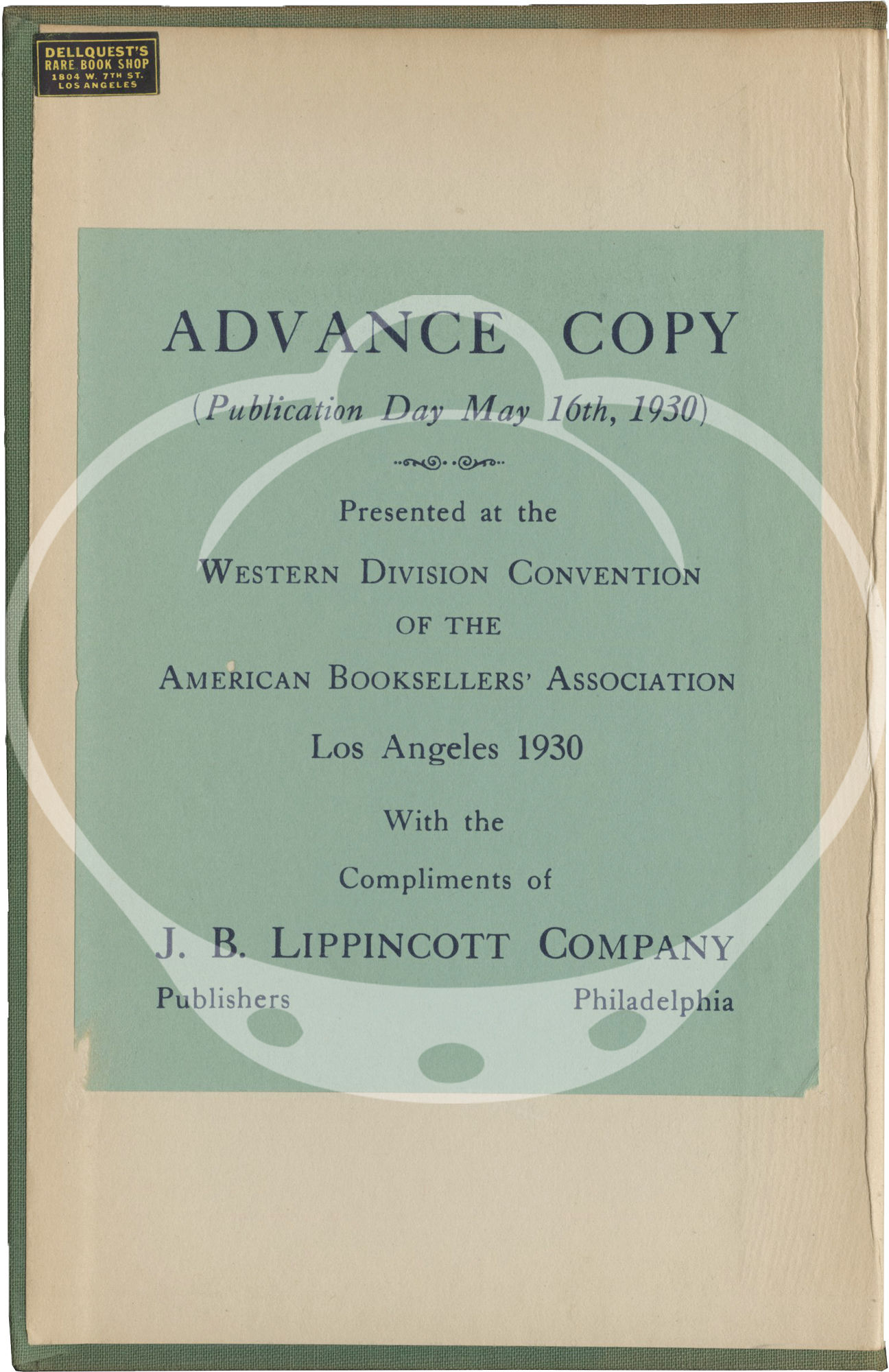 Philadelphia: J.B. Lippincott, 1930. First Edition. First Edition. With publisher's custom advance copy notice, specific to the 1930 ABA convention in Los Angeles, affixed on the front pastedown. Signed by the author in the year of publication on the front endpaper.