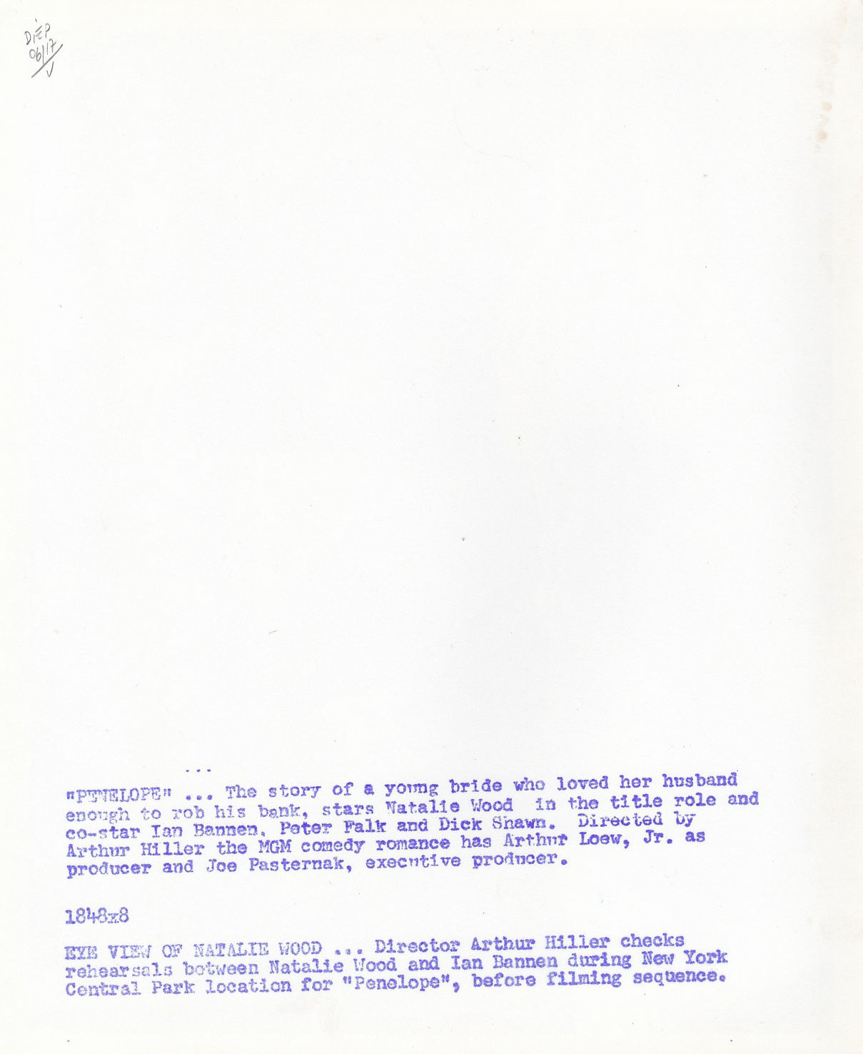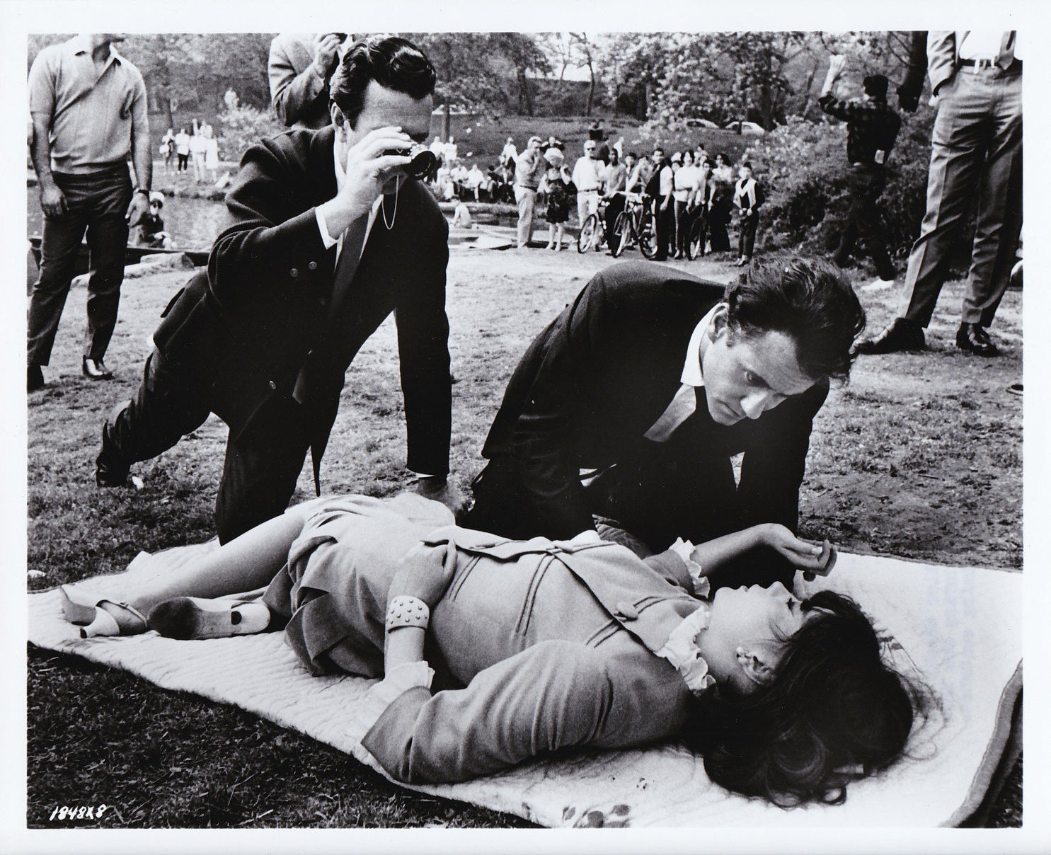Beverly Hills, CA: Metro-Goldwyn-Mayer [MGM], 1966. Vintage reference photograph from the 1966 film, showing director Arthur Hiller inspecting camera angles for actors Natalie Wood and Ian Bannen in between takes while filming on location in Central Park for the 1966 film. With a mimeo snipe on the verso.