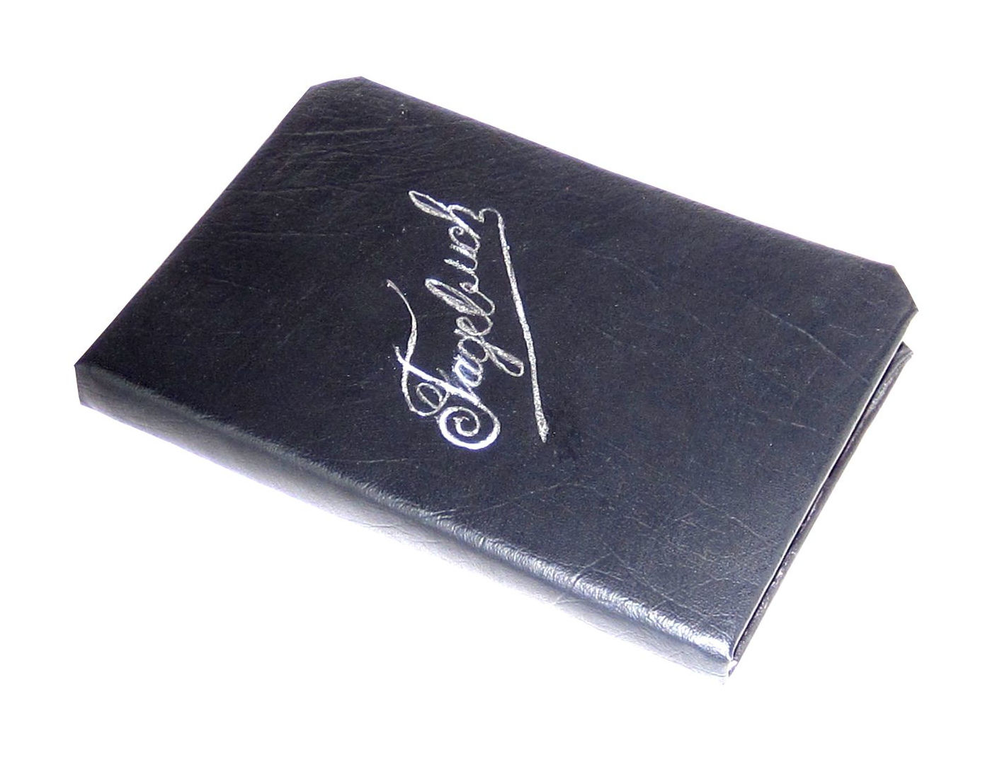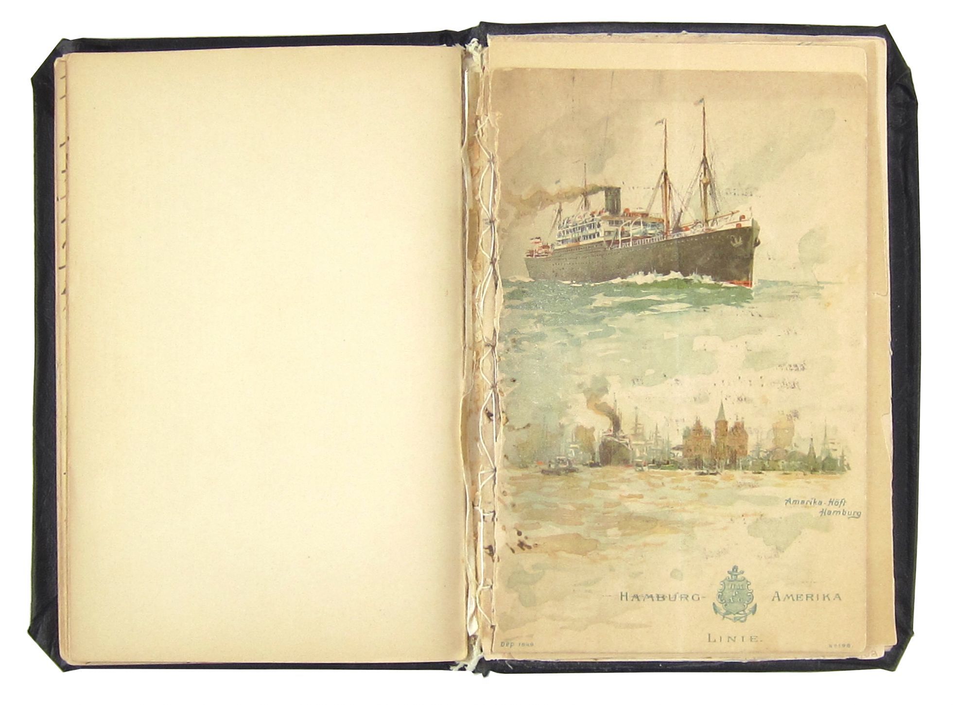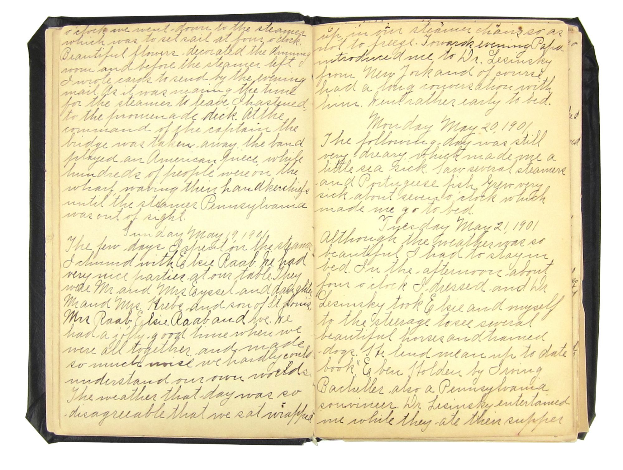 Belleville, Illinois, 1903. Very Good. Unpublished autograph travel diary in a small notebook. May-June 1901. One commercially-produced octavo notebook (19cm x 12cm) of 48 unlined pages, sewn gatherings, all pageblock edges gilt. Covered for preservation in black plasticized faux leather, with a stylized vintage label-Tagebuch [Journal]-painted in silver, by an amateur hand, on the front. The same party replaced the commercial endpapers with handmade fiber paper, and restitched the gatherings while sewing in the stiff cards of steamship ephemera.