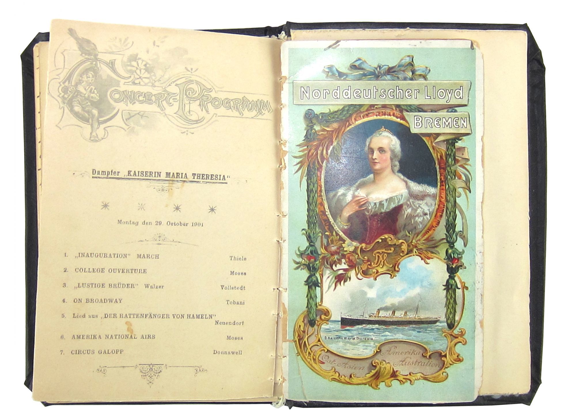 The ephemera are preserved from that trip and a later trip in 1903-four crossings altogether: two going east, two returning west. They comprise menus, music programs, and a passenger list, as follows, in the order of binding presentation: