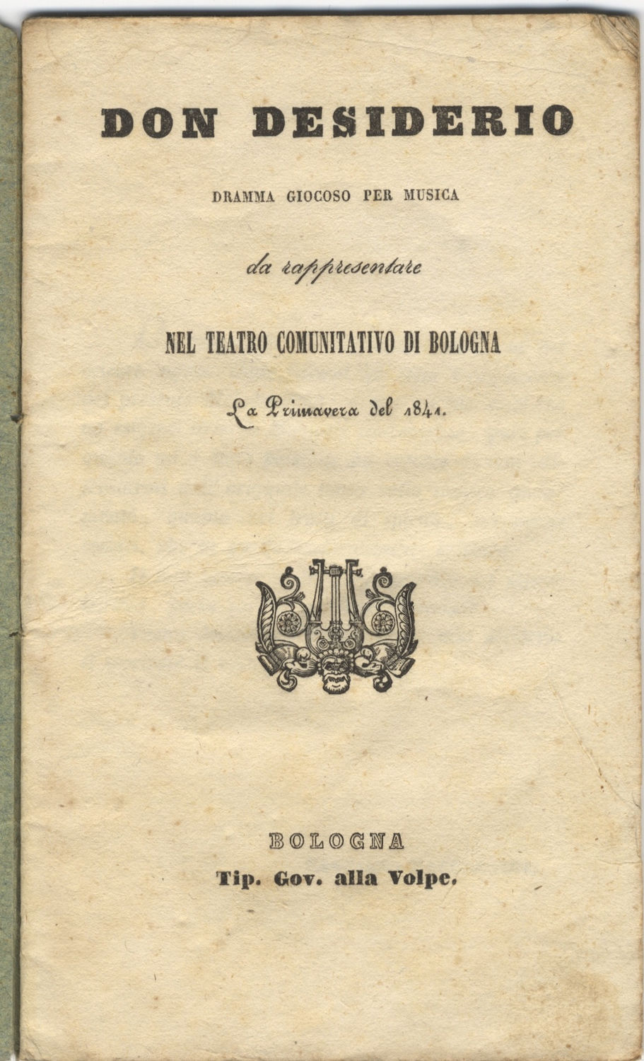 Don Desiderio Dramma giocoso per musica da rappresentarsi nel Teatro Comunitativo di Bologna La Primavera del 1841. [Libretto]