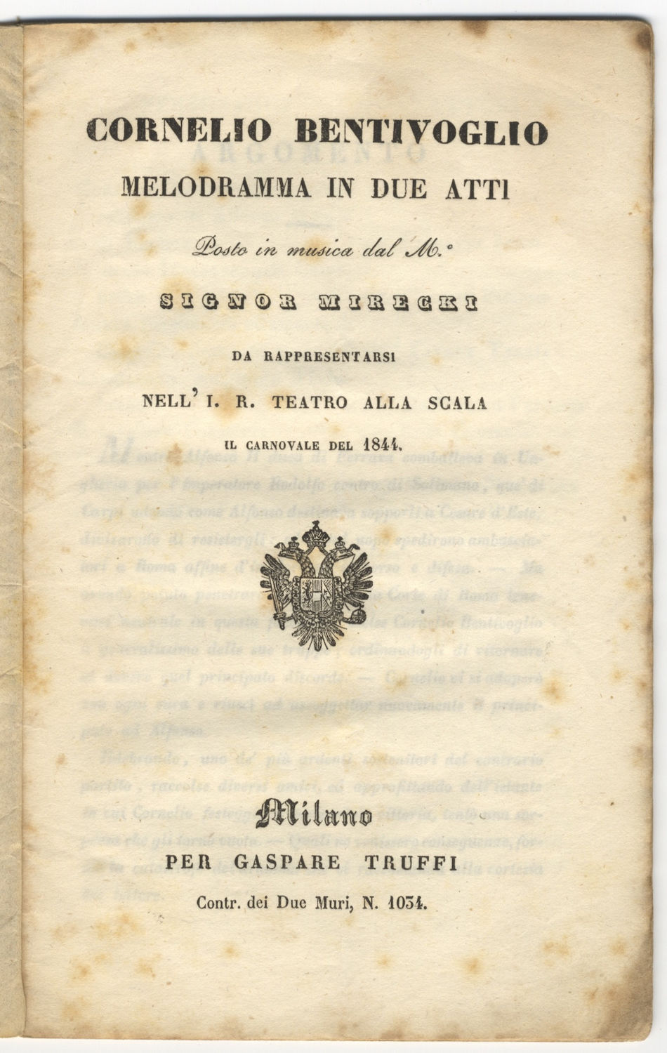 Milano: Gaspare Truffi, 1844. Octavo. Original publisher's wrappers with titling within decorative border. 1f. (recto title, verso blank), 1f. (recto "Argomento," verso blank), 1f. (named cast list), [7]-32 pp.