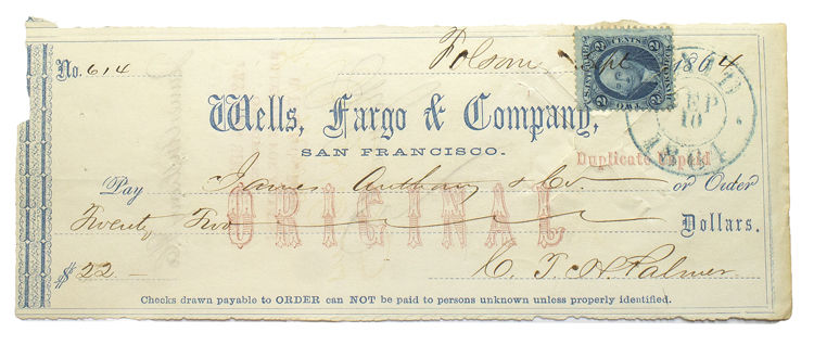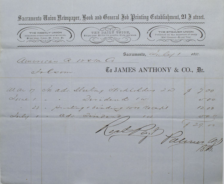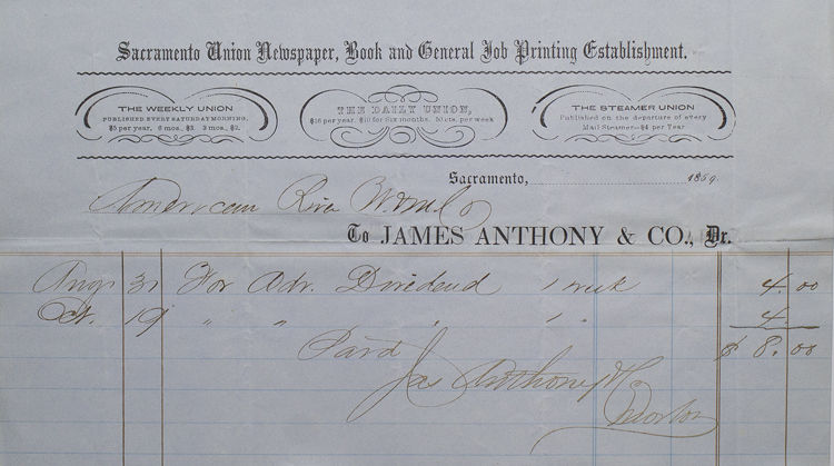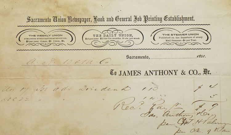 Sacramento, 1857. Three partially printed receipts, completed in manuscript; two them measuring roughly 5 x 81⁄2 inches, the third measuring 7 x 8 inches. Accompanied by a related Wells, Fargo & Company check, dated at Folsom, 1864. A few light folds. One of the receipts a bit stained. Overall, very good. In a half morocco and cloth box. Three partially printed receipts, completed in manuscript; two them measuring roughly 5 x 81⁄2 inches, the third measuring 7 x 8 inches. Accompanied by a related Wells, Fargo & Company check, dated at Folsom, 1864. A nice grouping of receipts, showing the prices charged by the SACRAMENTO UNION Newspaper, Book and General Job Printing Establishment for printing and advertising services. Each of the receipts is made out to the American River Water and Mining Company. The receipt dated 1857 is for advertising "electing stockholders," as well as for advertising dividends and for job printing and binding. The 1858 and 1859 receipts are both for advertising services, and all three are marked as having been paid. The group is accompanied by a check drawn on Wells, Fargo & Company and dated at Folsom in 1864. The check pays James Anthony & Company, who appear to have been financial agents for the SACRAMENTO UNION, and is signed by C. Palmer, who was likely an officer of the American River Water and Mining Company. Interesting evidence of the business of newspaper advertising and printing services in California in the late 1850s.