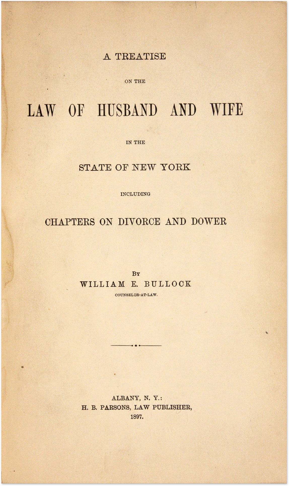 1897. Albany: H.B.Parsons, 1897. 1st & only edition. Albany: H.B.Parsons, 1897. 1st & only edition. Bullock, William E. A Treatise on the Law of Husband and Wife in the State of New York including Chapters on Devorce and Dower. Albany: H.B.Parsons, 1897. xxxiv, 428 pp. (9-1/4" x 6-1/4"). Ex-library, early 20th century brown buckram with chipped and worn upper red and lower spine labels. Residue of shelf location label at foot of spine, small bar code label on front cover and property stamps. Internally clean and bright. $85. * First edition.