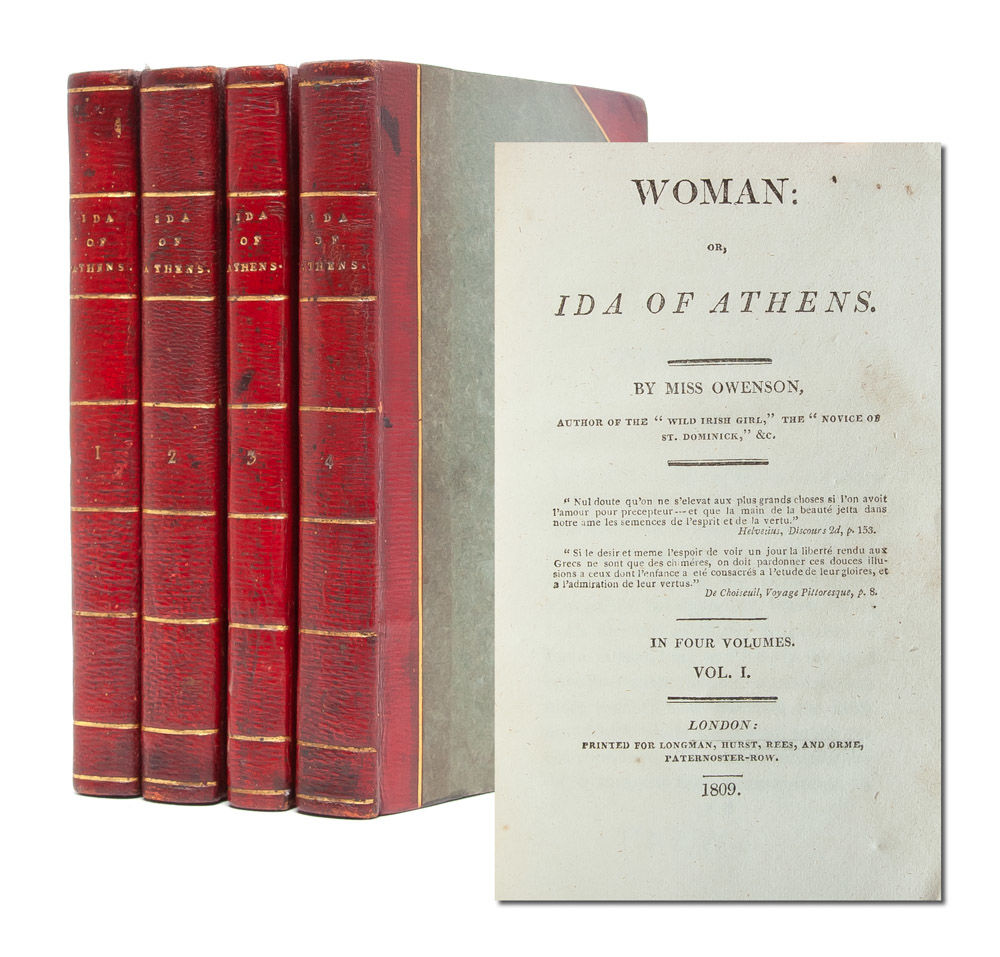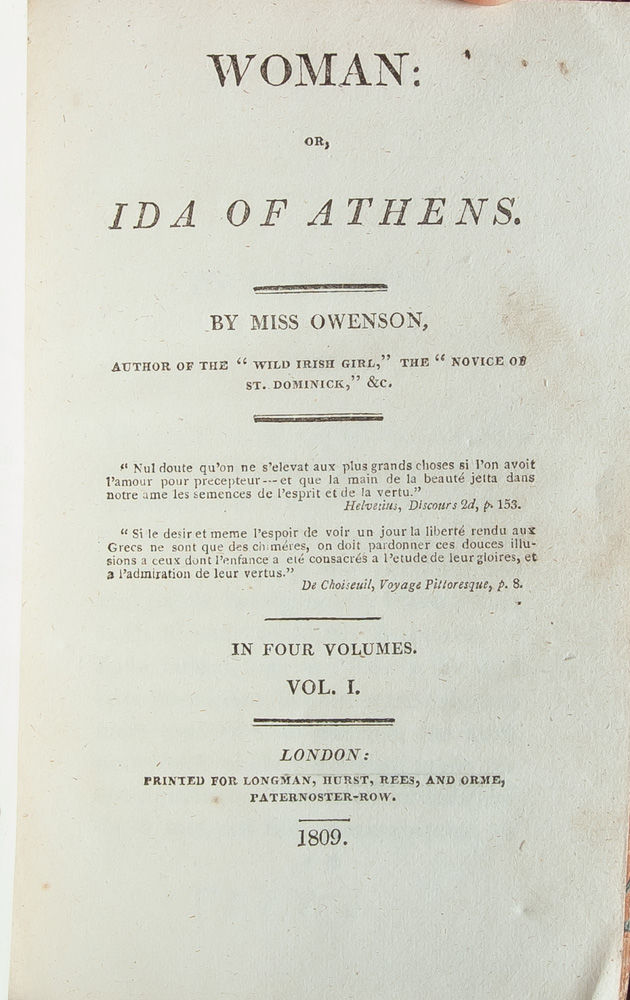 Intelligent and independent, Sydney Owenson supported herself as a governess turned novelist before her marriage to Sir Charles Morgan, opting to continue as an author after becoming a wife. After all, her parents' penury and her mother's early death had taught her the dangers of women's dependence on men. Therefore, "in her marriage contract Sydney kept her own property separate, and so was always financially independent" (Byrne-Costigan). An incredibly popular novelist in her own time, her works continually emphasized the intellectual and social strengths of female protagonists. The present work was inspired by the suggestion of antiquary William Gell, who recommended several books to her about the cause of liberty in Greece. The result was Woman, or Ida of Athens, a character study that "attempted to delineate perfected feminine character in its natural state and Greece as the perfect setting for doing so -- although the final scenes (with Ida suddenly enriched) take place in London" (ODNB). In addition to lengthy considerations on topics including education, civil and religious freedom, natural beauty, and morality, Owenson infused throughout feminist concerns about women's place and ability to contribute to or benefit from such structures. An early feminist novel, written by an author who enacted those principles in her own life.