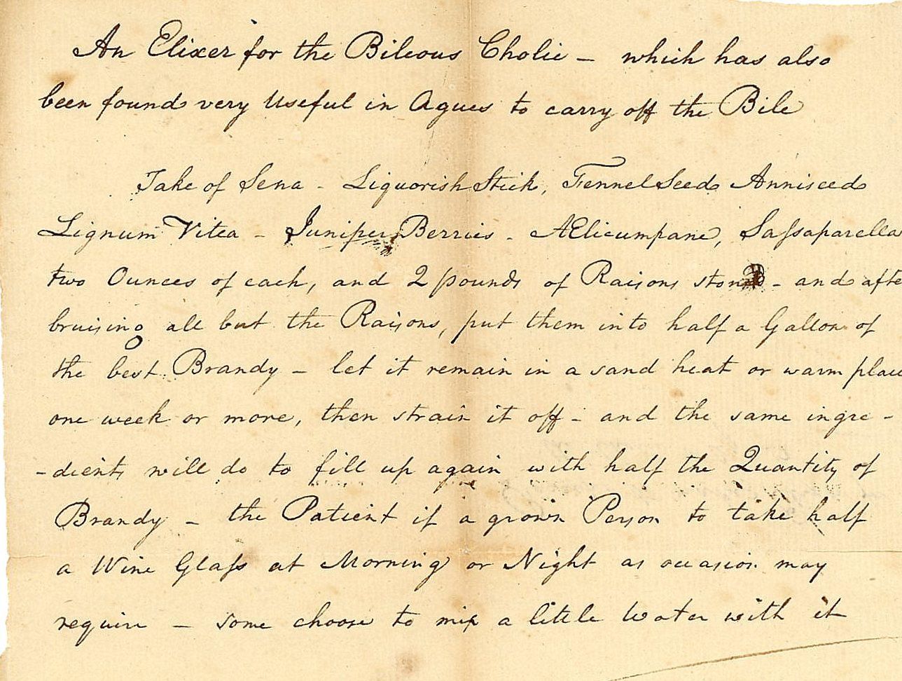 Receipt to make Elixer (sic) for the Bilious Cholic - which has also been found very useful in Agues to carry of the Bile