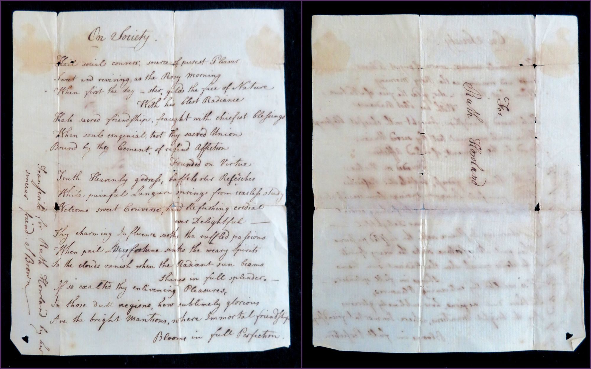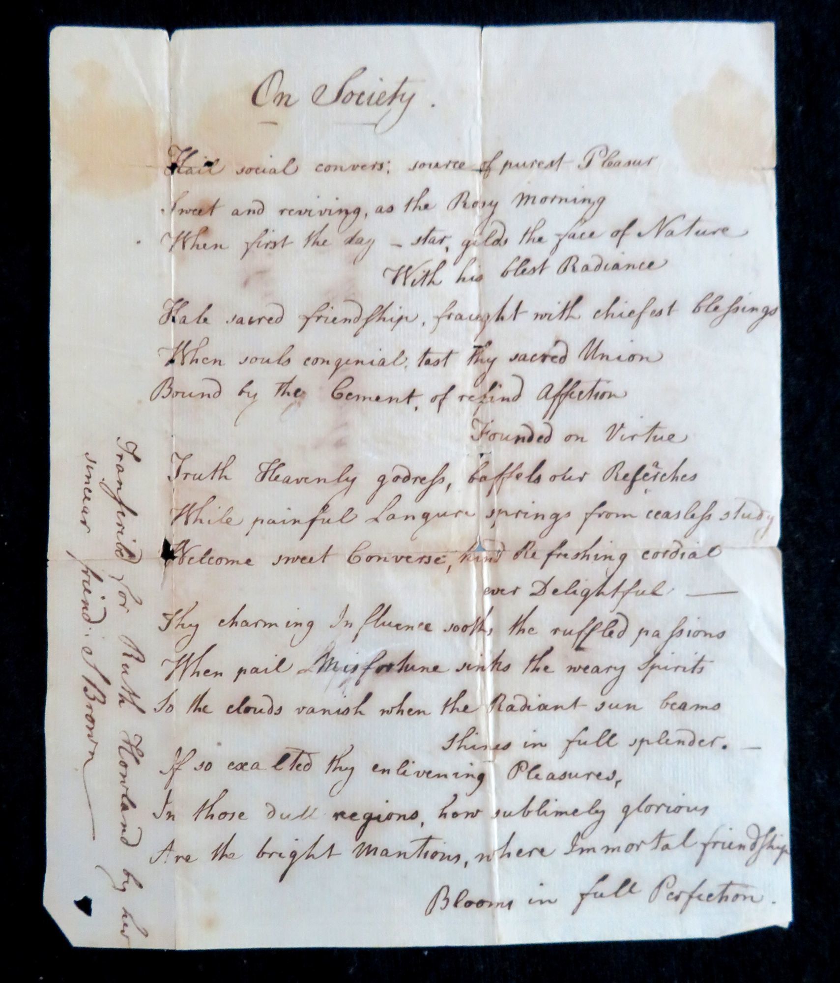 Rhode Island or Bellow Falls, VT, 1820. General wear. Minor stains. Minor tears along letter folds. Archival (?) tape repair on reverse.. A poem entitled "On Society" transcribed for Ruth Howland by her "sincere friend", S. Brown. The poem talks of friendship and the pleasure of social bonds. Below are a few of the poems stanzas: