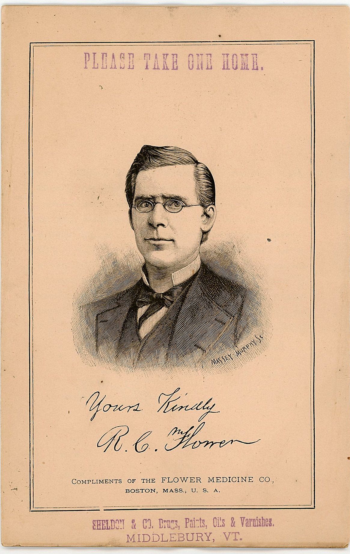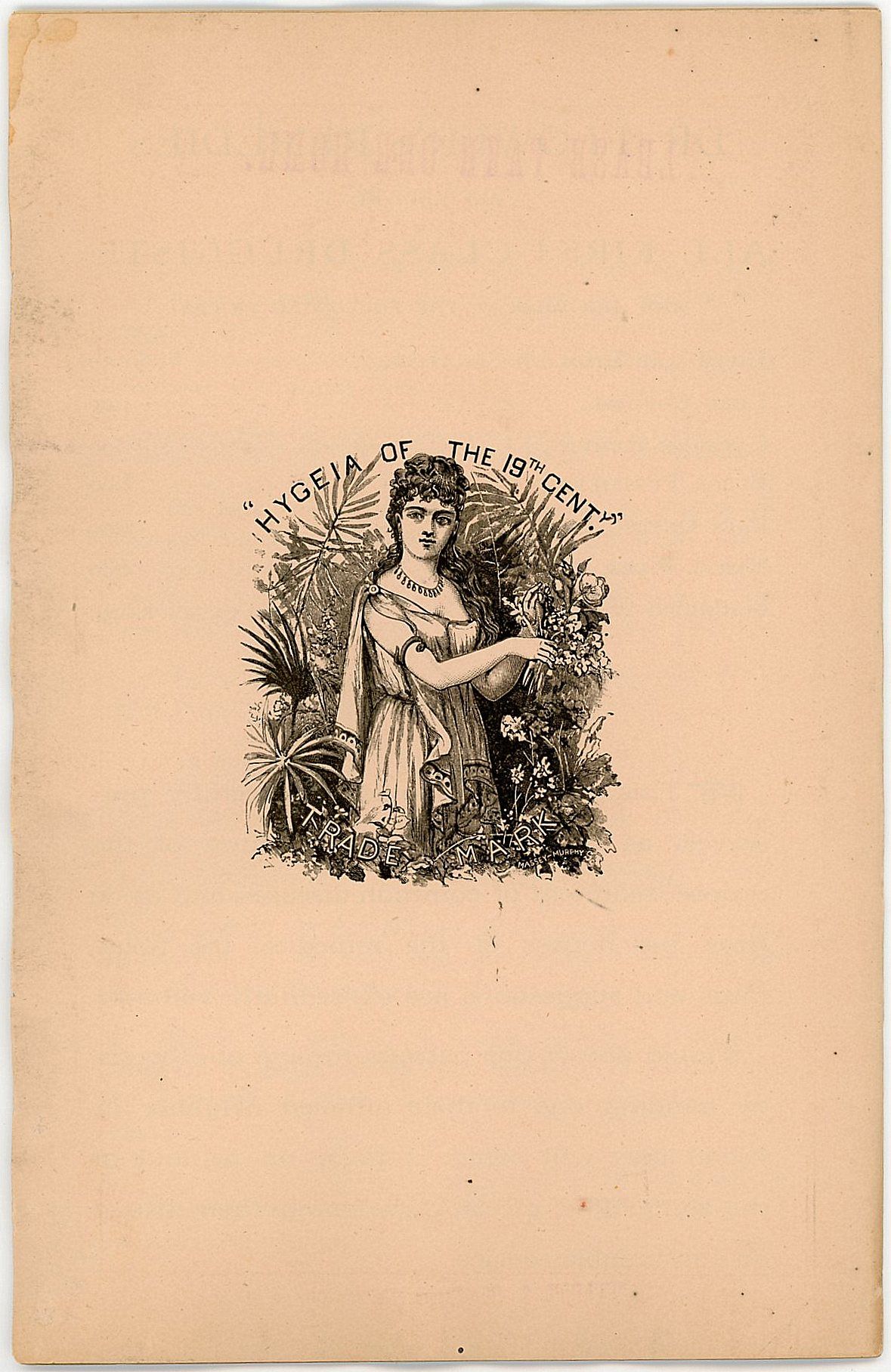 1884. 24 pp. Illustrated wrap with image of R. C. Flower on the front cover and "Hygeia of the 19th Cent" on reverse. A free to the public narrative introducing the company, the science in the preparation and skillful combinations. This is followed by detailed information on each of the companies numerous products with only the use of different type face for embellishment. It concludes with Testimonials. The inside back cover is a price list and includes Liver and Stomach Sanative, Lung Cordial, Catarrh Remedy, Blood Purifier, Pain Destroying Elixir, Nerve Pills and Magnetic Plasters. Measures 8 3/4" x 5 3/4