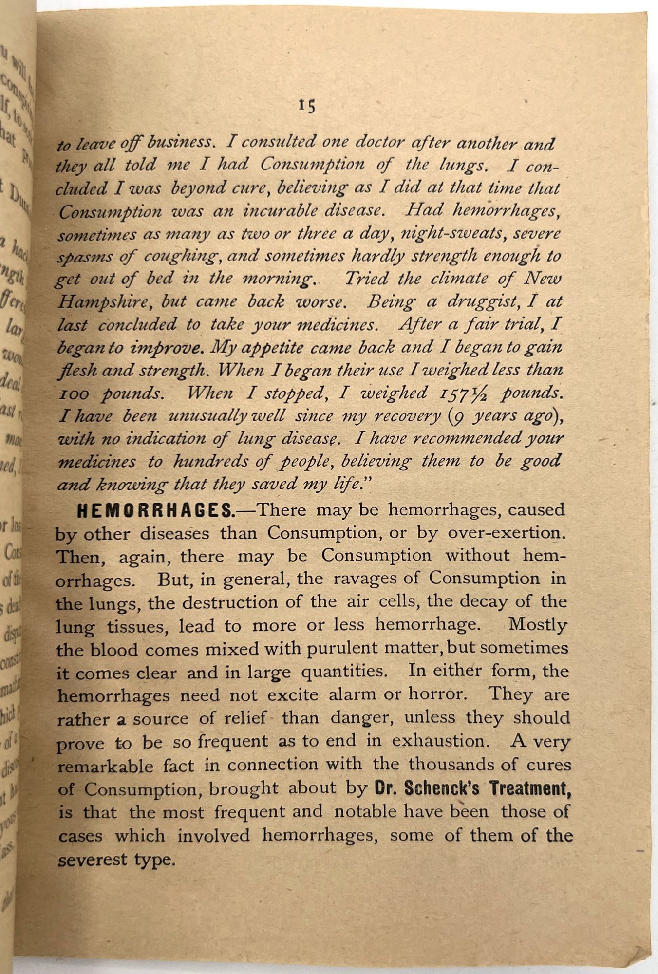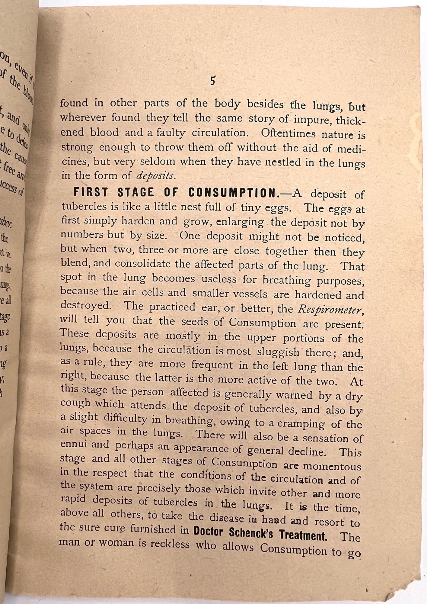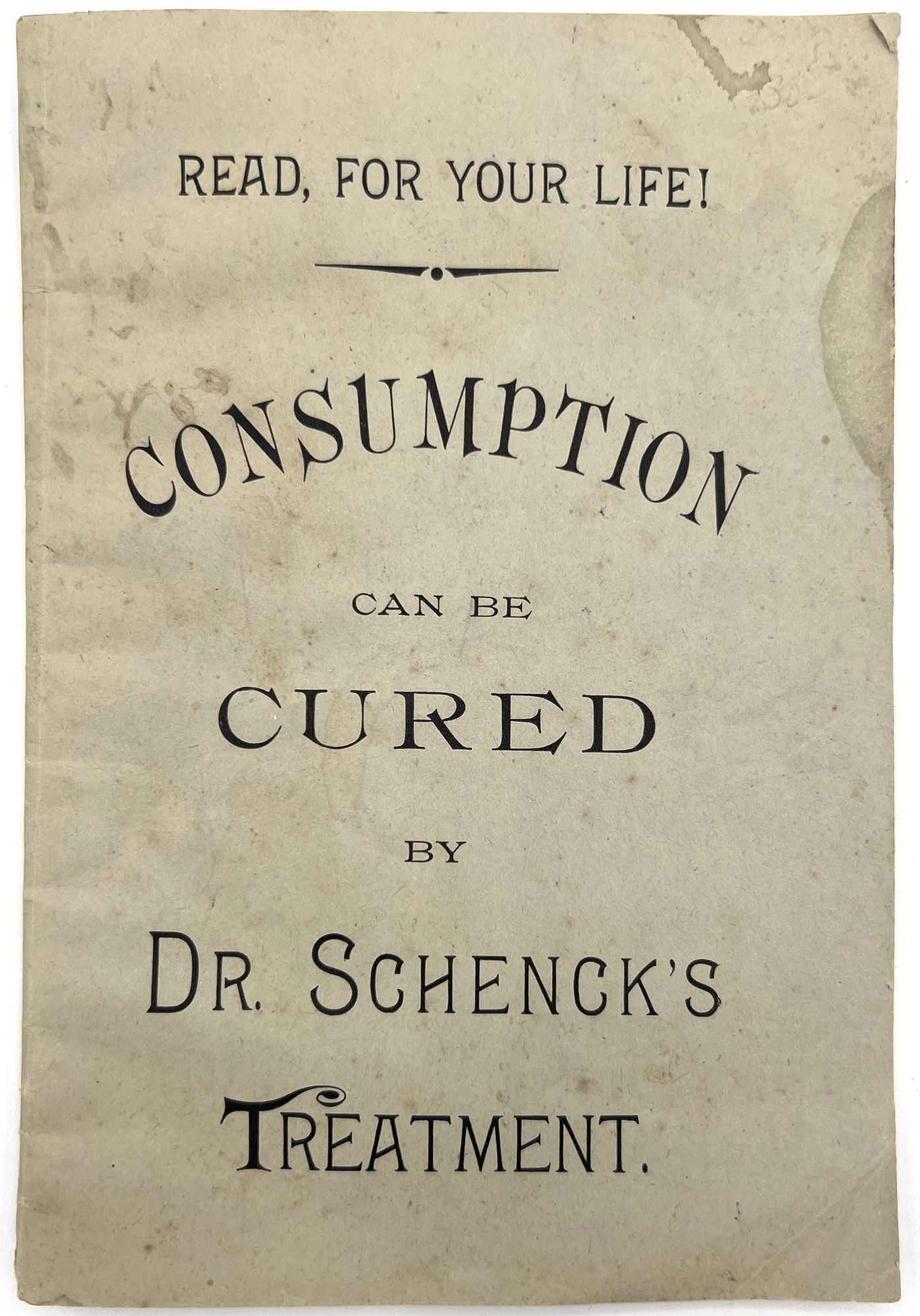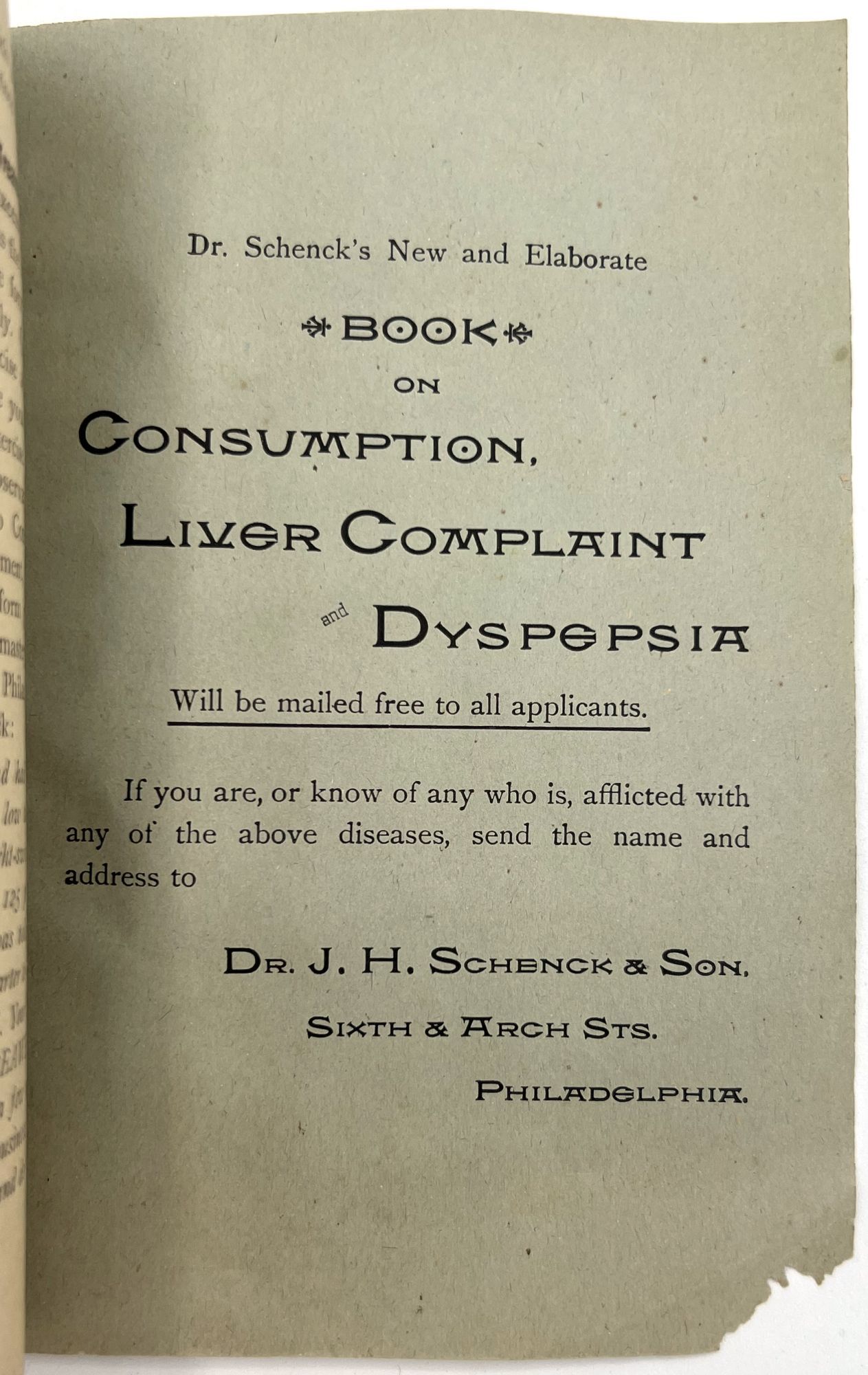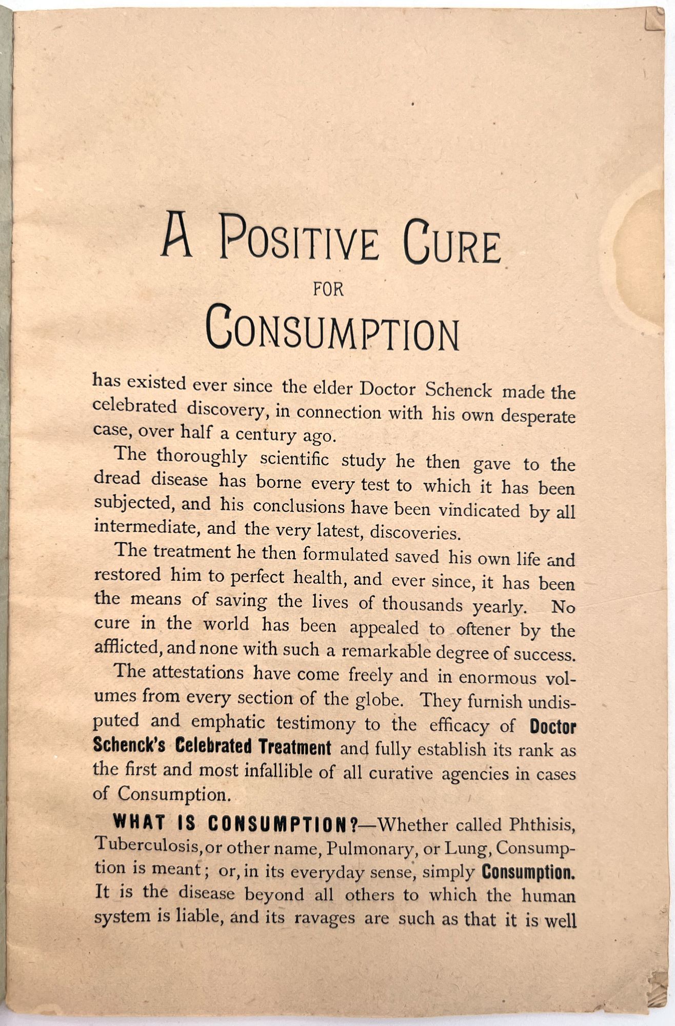 Philadelphia: Dr. J. H. Schenck & Son, 1880. Moderate wear.. 32 pp. wraps. First page titled "A Positive Cure for Consumption" explaining consumption, the origin of consumption, the tubercle, the various stages, the symptoms including cough, wasting away, hemorrhages, night sweats and hectic cheeks, poor appetite and bad digestion and diarrhea and of course, how Schenck's product will cure the same. Measures 7" x 5