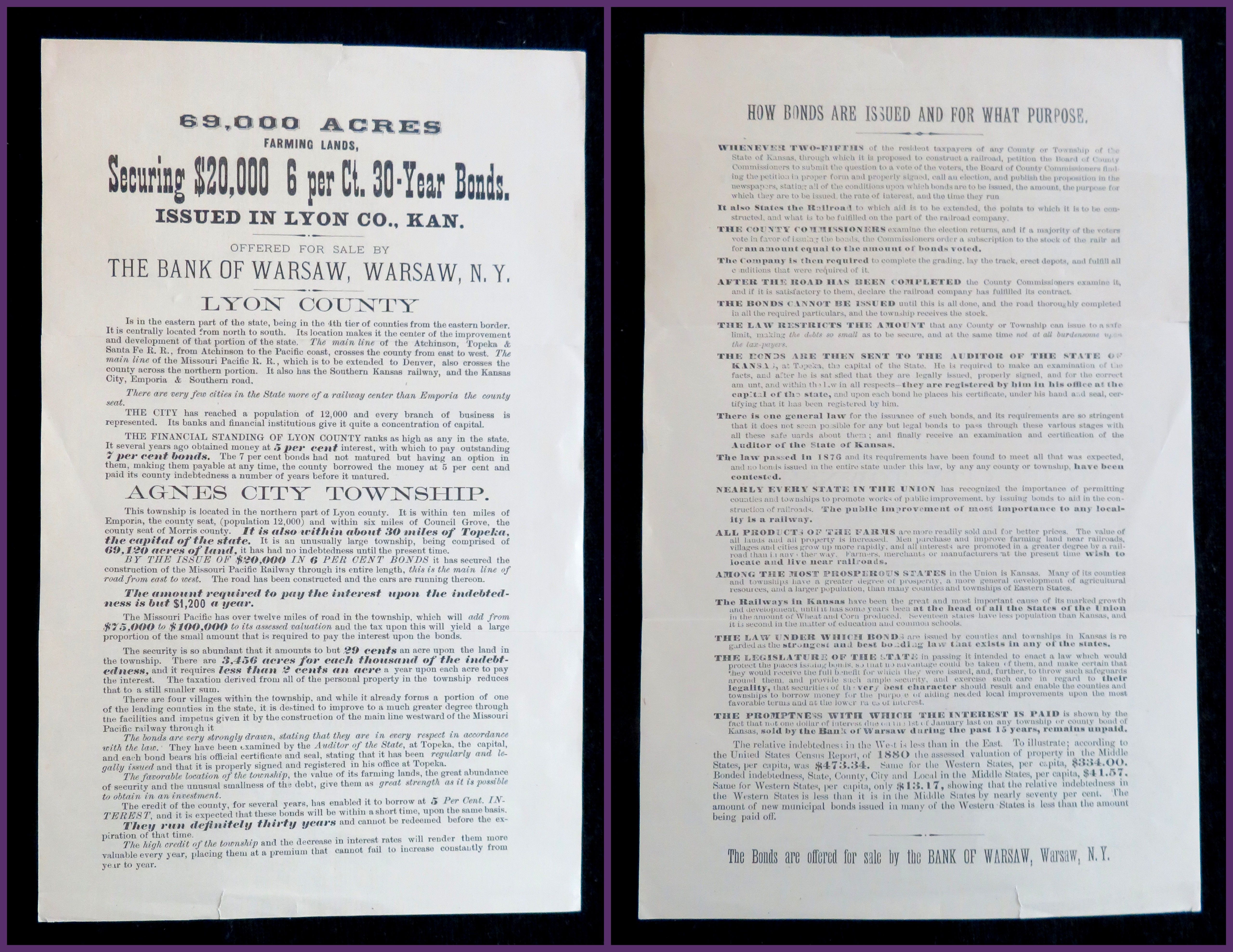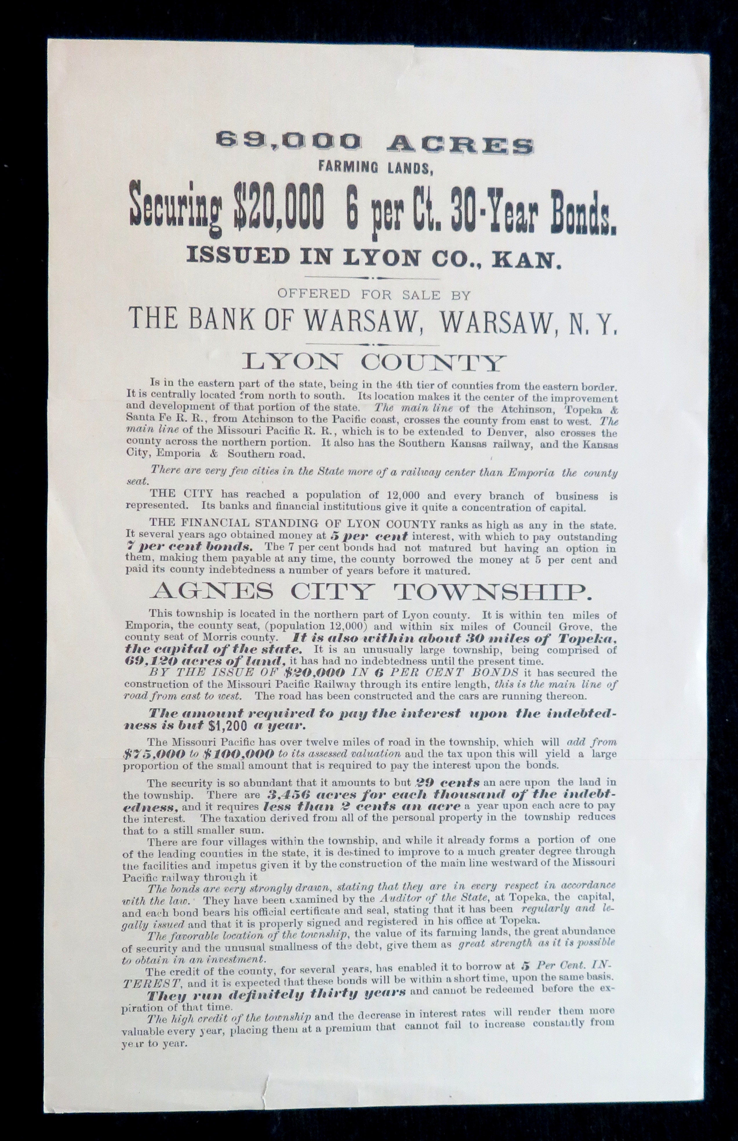 There was around 69,000 acres available in Agnes City Township, which was located 30 miles southwest of Topeka, KS. Each bond was issued with 6 percent interest over 30 years and was financed by the Bank of Warsaw, located in Warsaw, NY.