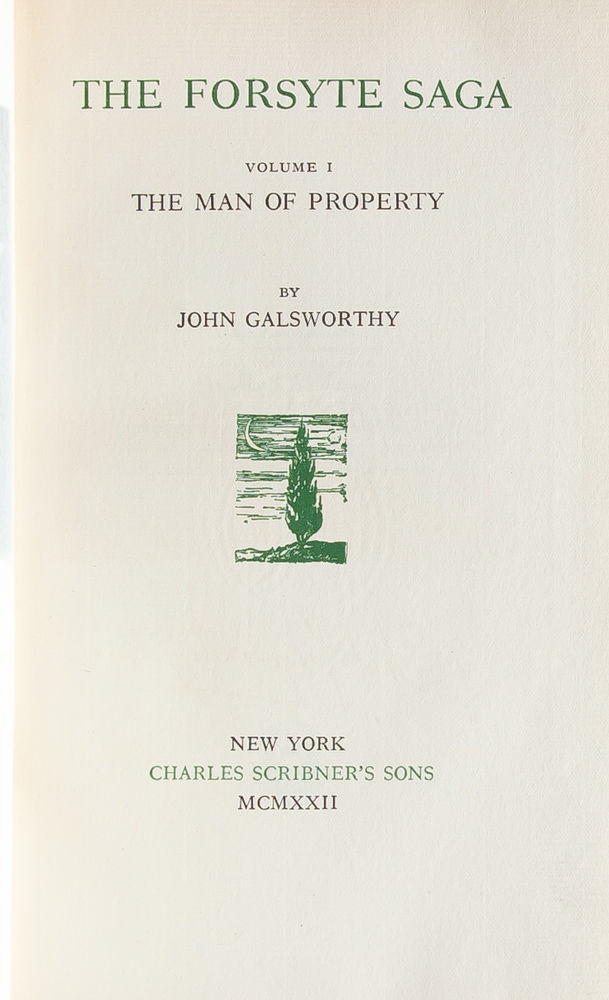 Trained to be a lawyer, John Galsworthy turned instead to writing. Born in Surrey, England and educated at Oxford, Galsworthy traveled around the world rather than practice law. On these travels he met Joseph Conrad, and the two men become life-long friends. Galsworthy is best known for his The Forsyte Saga, a highly regard series published from 1906-1921. In addition to his writing, Galsworthy argued for prison reform and animal rights. He won the Nobel Prize for Literature in 1932. Near Fine.
