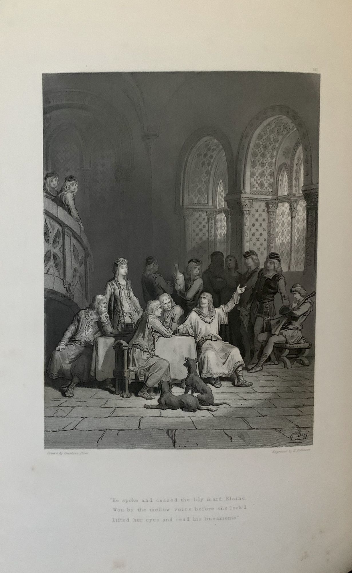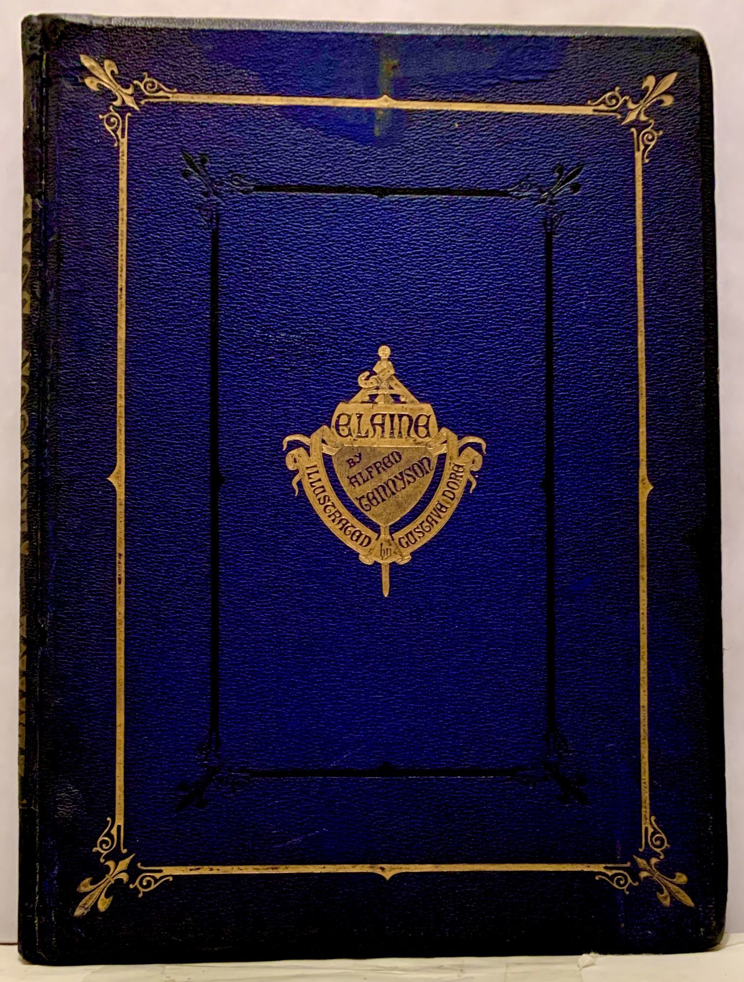 London: E. Moxon, Son, & Co, 1867. First edition. leather_bound. Orig. publisher blue morocco, rectangular gilt front cover frame houses center gilt escutcheon, beveled edges. Aeg. Very good. Folio, 35.5 x 26.5 cm. Enid, Elaine, Vivien and Guinevere were part of a series published by Moxon, illustrated by Dore. Enid is the Fourth Part of Idylls of the King. Nine steel engraved plates: according to the publisher, the engravings on steel from Dore's drawings, were executed at a cost of nearly six thousand pounds; the only publisher to commission Dore for steel engraved work. Backstrip extremity nicks, lower corners rubbed, mauve endpapers, owner inscription half title in small neat hand dated 1868, modest toning to first few leaves. Repair to lower backstrip.