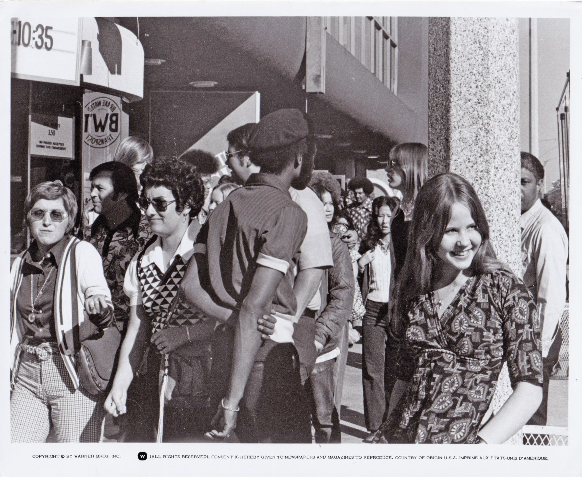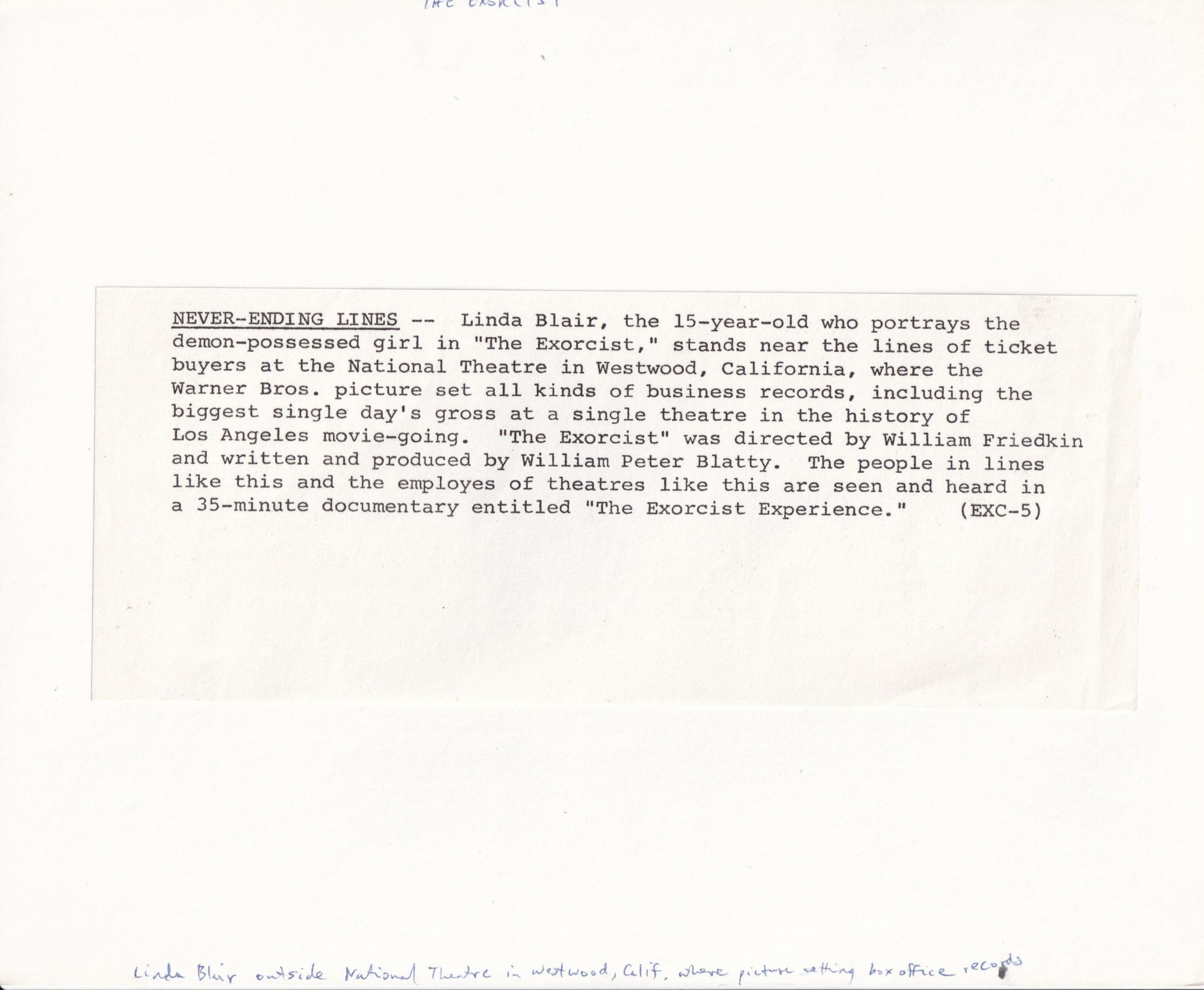 Burbank, CA: Warner Brothers, 1973. Vintage publicity photograph of actress Linda Blair in front of the National Theatre in Westwood, California, where crowds have lined up to see "The Exorcist." With a printed mimeo snipe affixed to the verso.