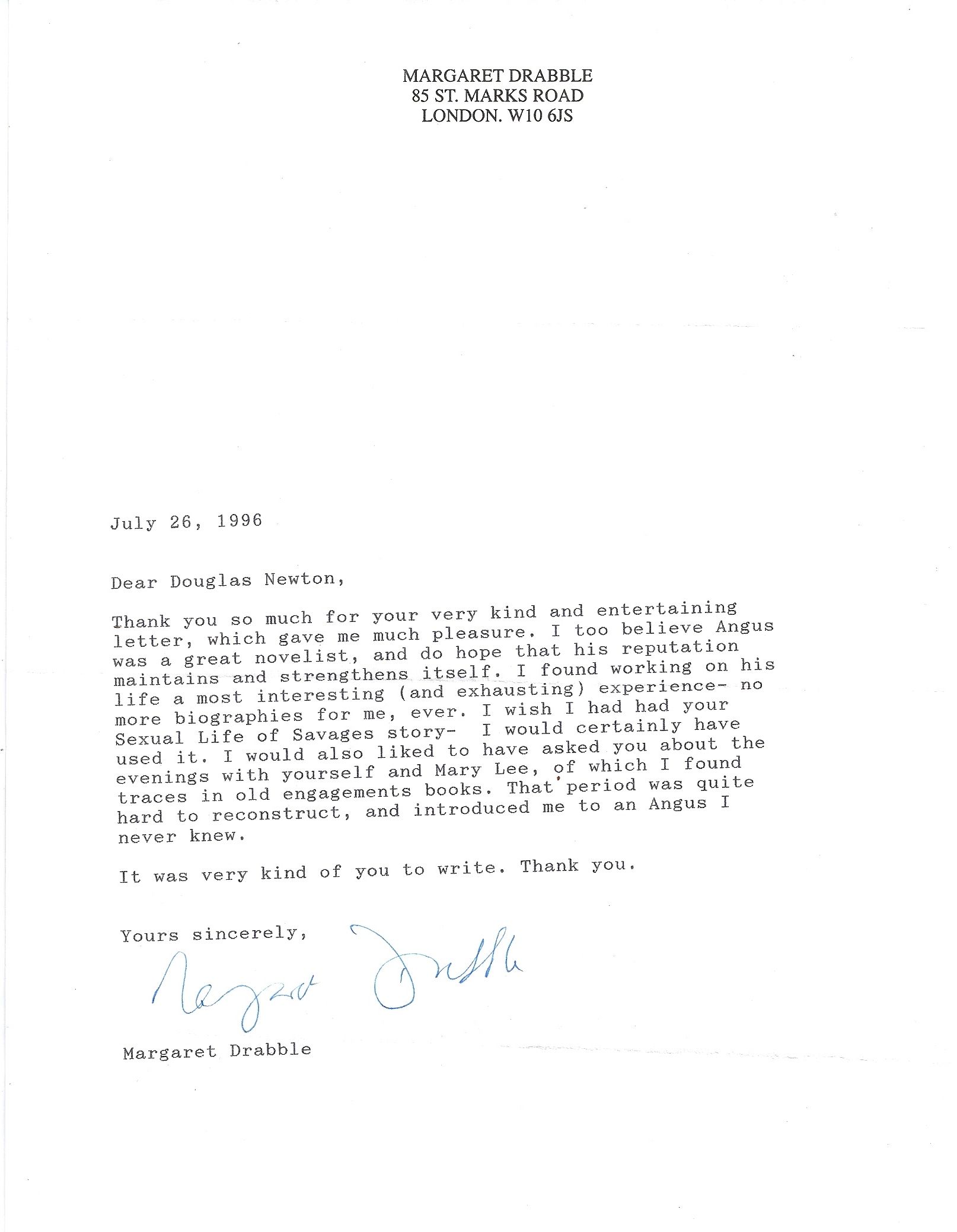 London, 26 July 1996. Hardcover. Folds from mailing, a few light creases. Near Fine. An interesting letter to poet Douglas Newton about her biography of author Angus Wilson, published in 1995. In part: "I found working on his life a most interesting (and exhausting) experience-- no more biographies for me, ever."