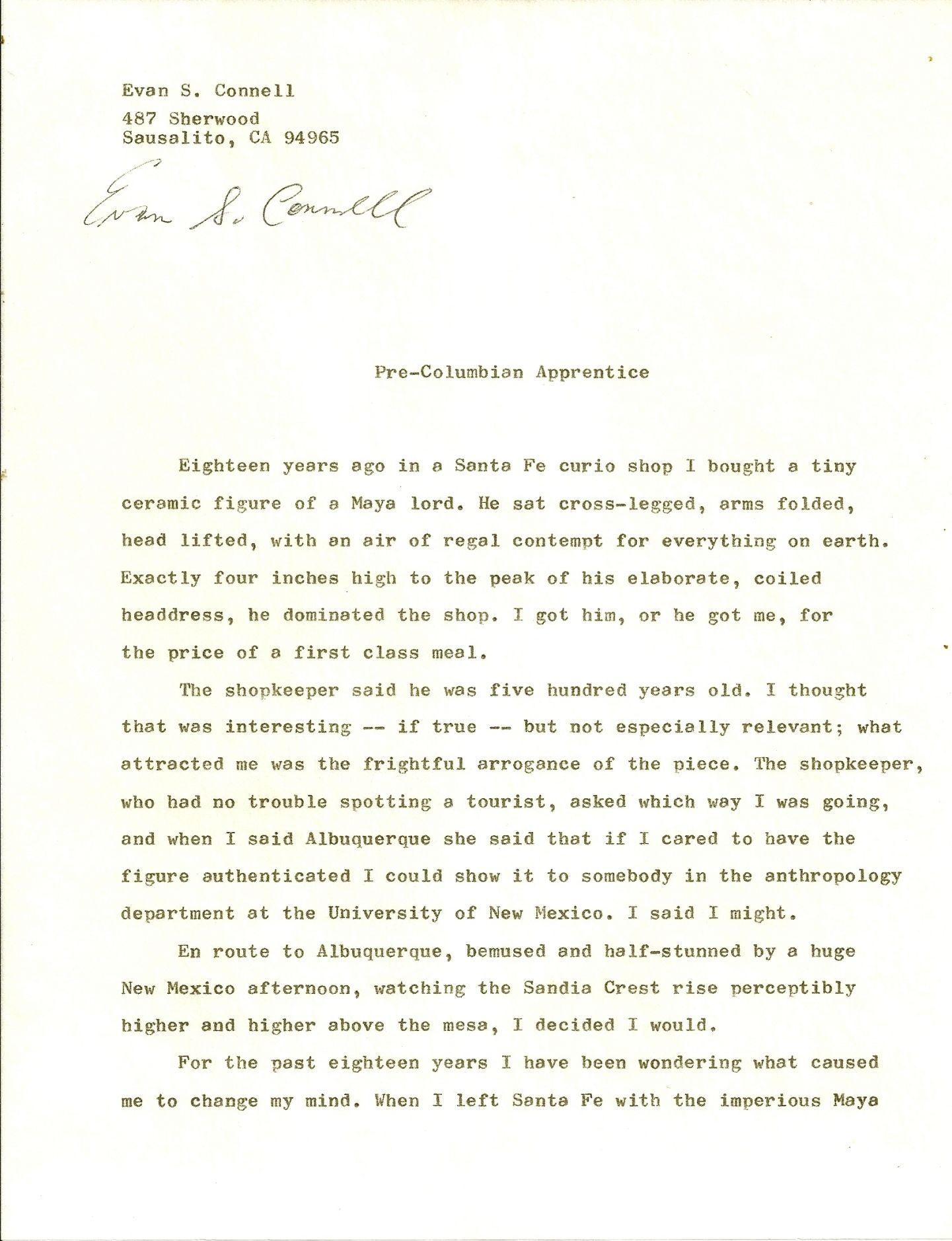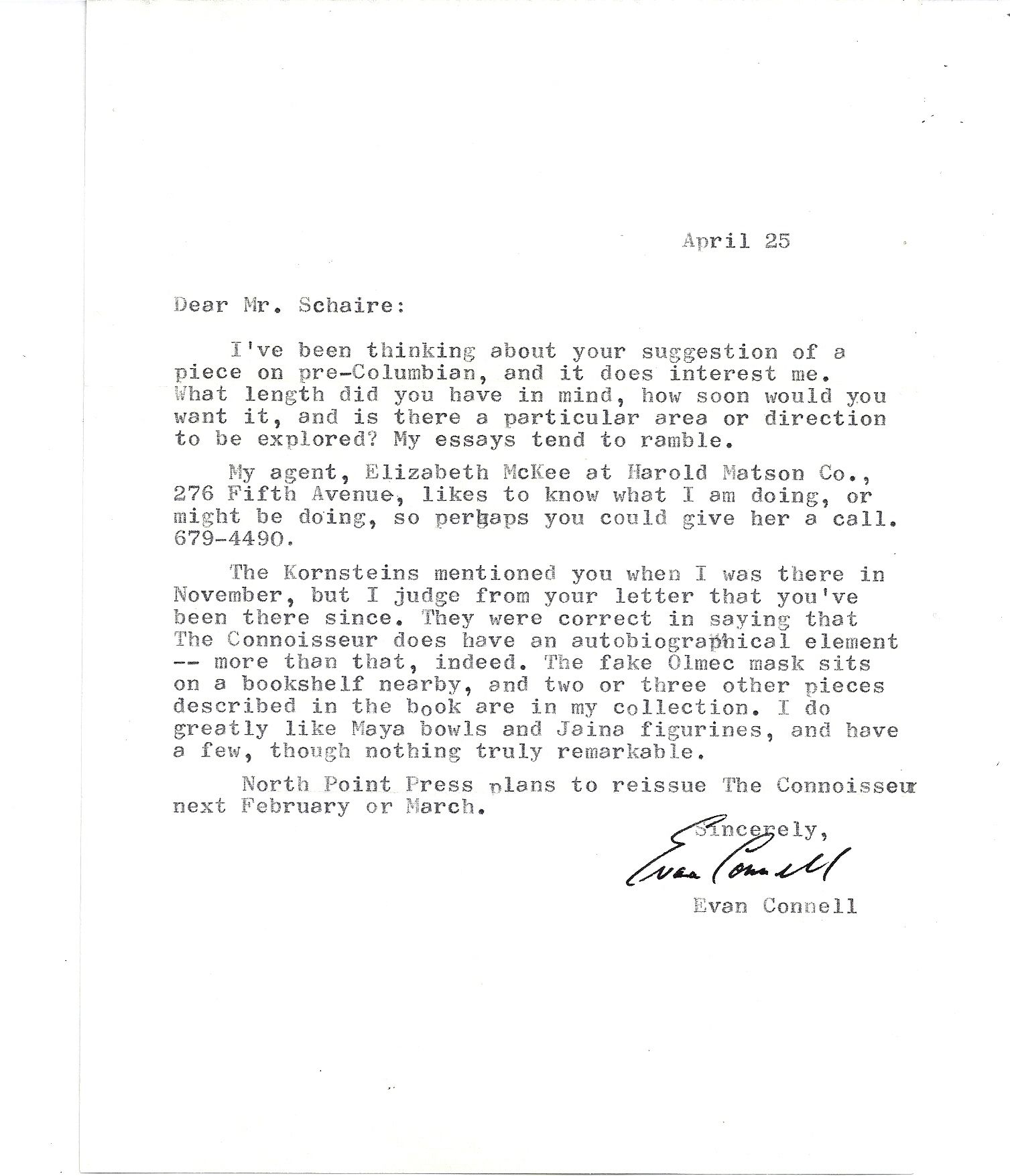Sausalito, CA, 1986 - 1988. Letter. Condition varies a bit, but mostly Near Fine to Fine. The eight-page TYPED MANUSCRIPT, titled "Pre-Columbian Apprentice" and SIGNED by Connell at the top of the first page, recounts his purchase of a 500 year-old Mayan ceramic figure and how that led him to collect pre-Columbian art and inspired him to write a novel about such a collector, THE CONNOISSEUR. The 8 TYPED LETTERS SIGNED are to the Executive Editor of ARTS & ANTIQUES Magazine, Jeffrey Schaire, and are all connected to the article in one way or another, from gaining interest in writing it to making suggestions on it before publication. There is also ancillary material including a letter from Connell to a friend about his old teachers, the death of Frank Waters, and the galleys of his collected stories; a press release for one of Connell's books SIGNED by him; a letter from Connell's agent; a letter from a gallery owner; and various news clippings and photocopied articles.