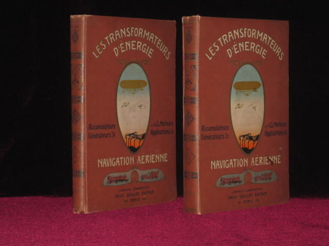 Paris: Aristide Quillet, 1910. First Edition. Hard Cover. Fine. Quarto. In two volumes. 221pp. text volume profusely illustrated in black and white, atlas volume containing 13 leaves of COLOR diagrams with MOVEABLE OVERLAYS mounted on stiff boards. Both volumes bound in original brown pictorial cloth lettered and decorated in blue, orange, gold, black and white; decorative endpapers; minor wear to spine ends. A very handsome set of this guide to contemporary sources of energy for transportation and industry. Each plate with an explanatory leaf describing each device opposite the plate which includes; a compound steam locomotive, a Daimler automobile, a motorcycle and of course, the famed Wright brother's aircraft among others; with an historical survey of aviation with photogravure plates of Lilienthal's first flight and Delagrange's biplane. Internally clean and fresh with no foxing; a fine copy. Moveable plates complete, showing no wear or tears.