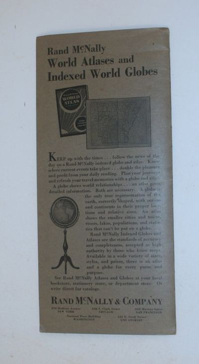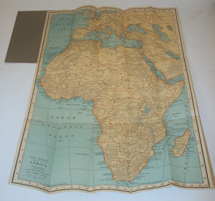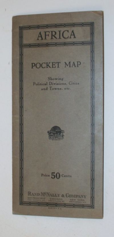 San Francisco, Chicago, New York: Rand McNally & Company, [ no date ]. Wraps. Near Fine. Folding grey printed wrappers, 4 1/4 x 9 1/4 containing a folding map of Africa. Wrappers with minor creasing, with an advertisement of Rand McNally atlases, world globes, etc on the rear cover. Unfolded, the map expands to 19 x 26 inches. Minor holes at the corners where it was pinned up at some point. Otherwise very clean internally. On the back of the map are towns and indices to finding them on the map. Wraps.