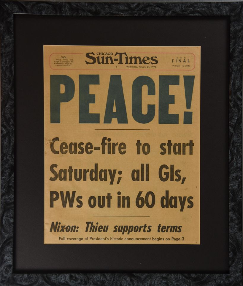 Chicago, 1973. The headline from the 24 January 1973 edition of the Chicago Sun-Times, which announced the beginning of the cease-fire which marked the beginning of negotiations to end the Vietnam War. Condition: Good to Very Good. Significantly age toned; a small open tear on the left edge and a small dark stain in the bottom left corner. Matted and framed; not examined out of frame.